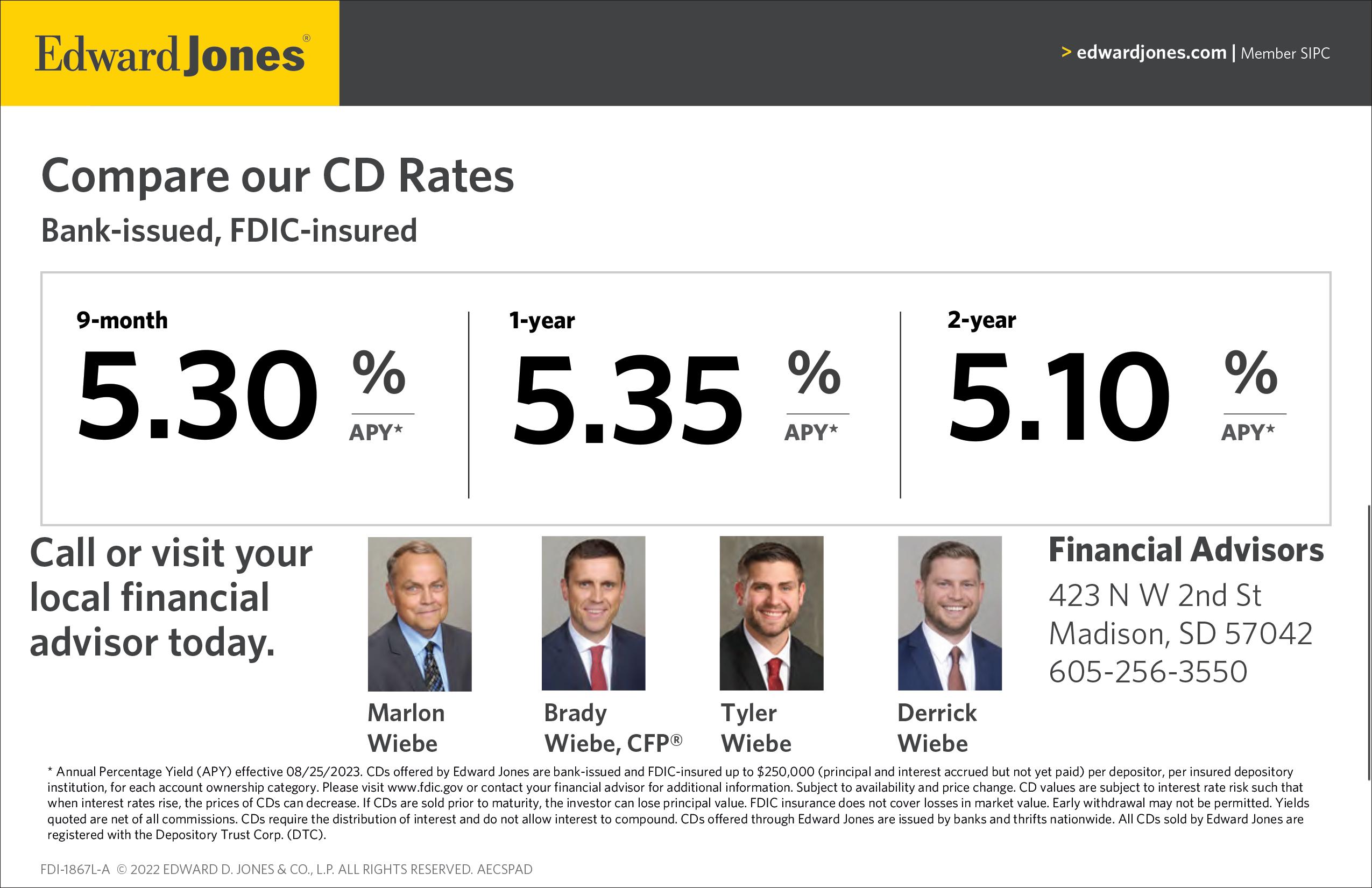 PAGE 22 Booster “We’ve Got You Covered ~ Since 1955”• Wednesday, August 30, 2023 *Annual Percentage Yield. APY accurate as of June 23, 2023. Minimum $25,000 deposit required to open account and obtain APY. Penalty for early withdrawal. Auto renews to BankWest 12-month CD term and rate at maturity. Limited time o er. O er not available for brokered, public or municipal funds. Member FDIC. 411 SE 3rd St. in Colman 605-494-4450 • www.bankwest-sd.bank TANNER DeKAM NMLS #2457349 TAMI GROOS CONNOR WELBIG 5.05 % APY* $25,000 minimum opening deposit Armour, Colman, Delmont, Geddes, Gregory, Kadoka, Kennebec, Madison Mitchell, Onida, Pierre, Rapid City, Selby, Spear sh, Tripp, Winner 6-MONTH CD Great Rate. Guaranteed Return.