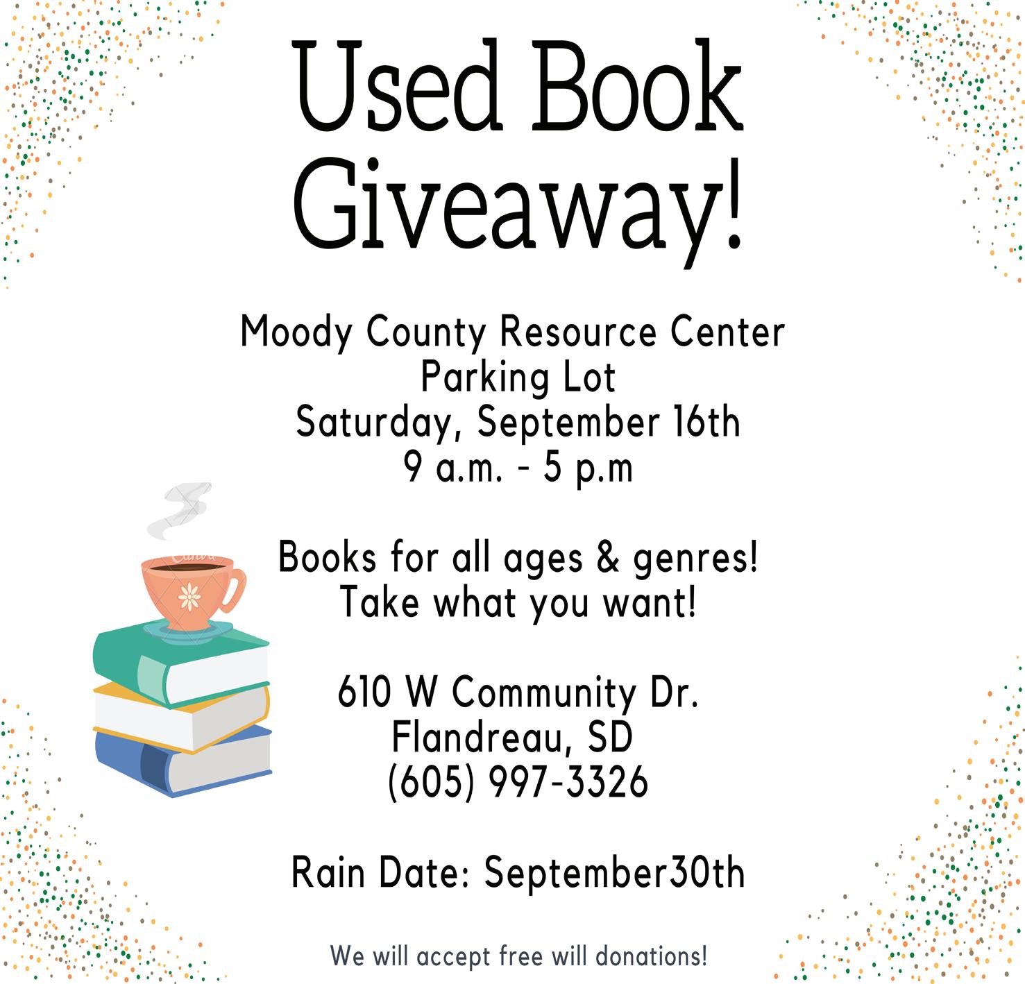 Mark your calendars for the Moody County Resource Center’s Used Book Giveaway on Saturday, September 16th from 9 am - 5 pm in the parking lot! Rain date September 30th! Call the library at 997-3326 for more info!