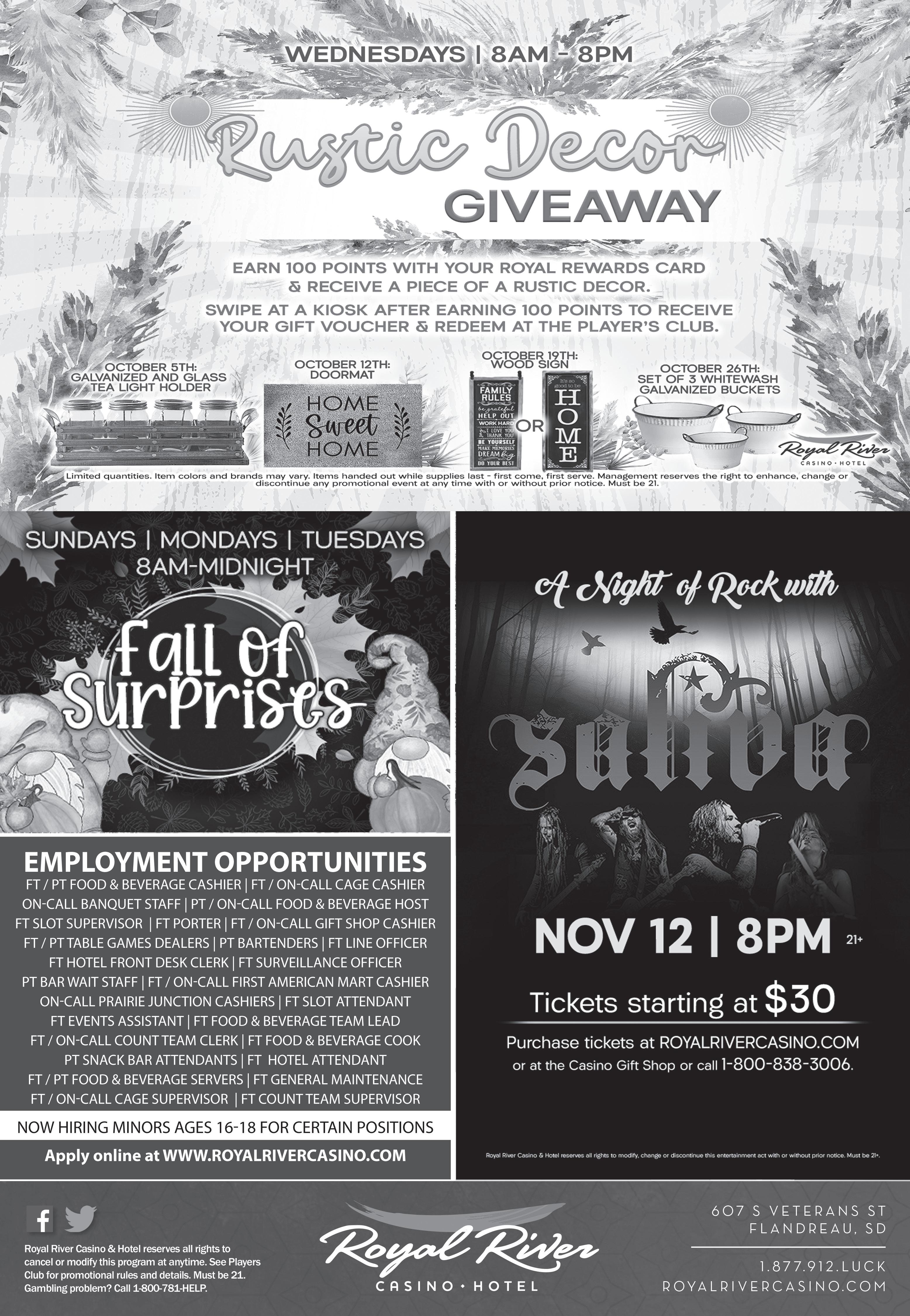 Booster “We’ve Got You Covered ~ Since 1955”• Wednesday, October 12, 2022 “Jobs Done Right” Amundson Construction 507-215-2240 Jason Amundson • Owner amundson1980@gmx.com Minnesota and South Dakota Residential/Commercial/Farm Shingles • Pole Barn Work Specializing In Interior Work Kitchens - Baths - Showers Drywall and Drywall Repair Trim • Ceilings • Interior/Exterior Doors • Decks • Tile Backsplashes • Crown Moulding NOW BOOKING WINTER WORK Kitchens / Bathrooms / Drywall Work Whatever you need done, large or small !!! Book now while slots are available !!! NOW HIRING May Construction, Madison, SD Underground Utility Work-Valid Drivers License requiredCDL preferred. Wage NegotiableCall Jeff 605-530-0311 B&B RV not only works on campers but can fix your trailer issues, wiring, brakes, bearings, and also light ATV & UTV work. 605-864-6258 Dakota Joe Coffee Co. Located inside The Royal River Casino 607 S. Veterans St., Flandreau 605-592-7166 Coffee. Espresso. Smoothies. Pastries. View our Menu on our facebook page! facebook.com/dakotajoecoffee 7:30 - 9:00 am (Donuts & Breakfast) 7:30 - 9:00 (Donuts & Breakfast)