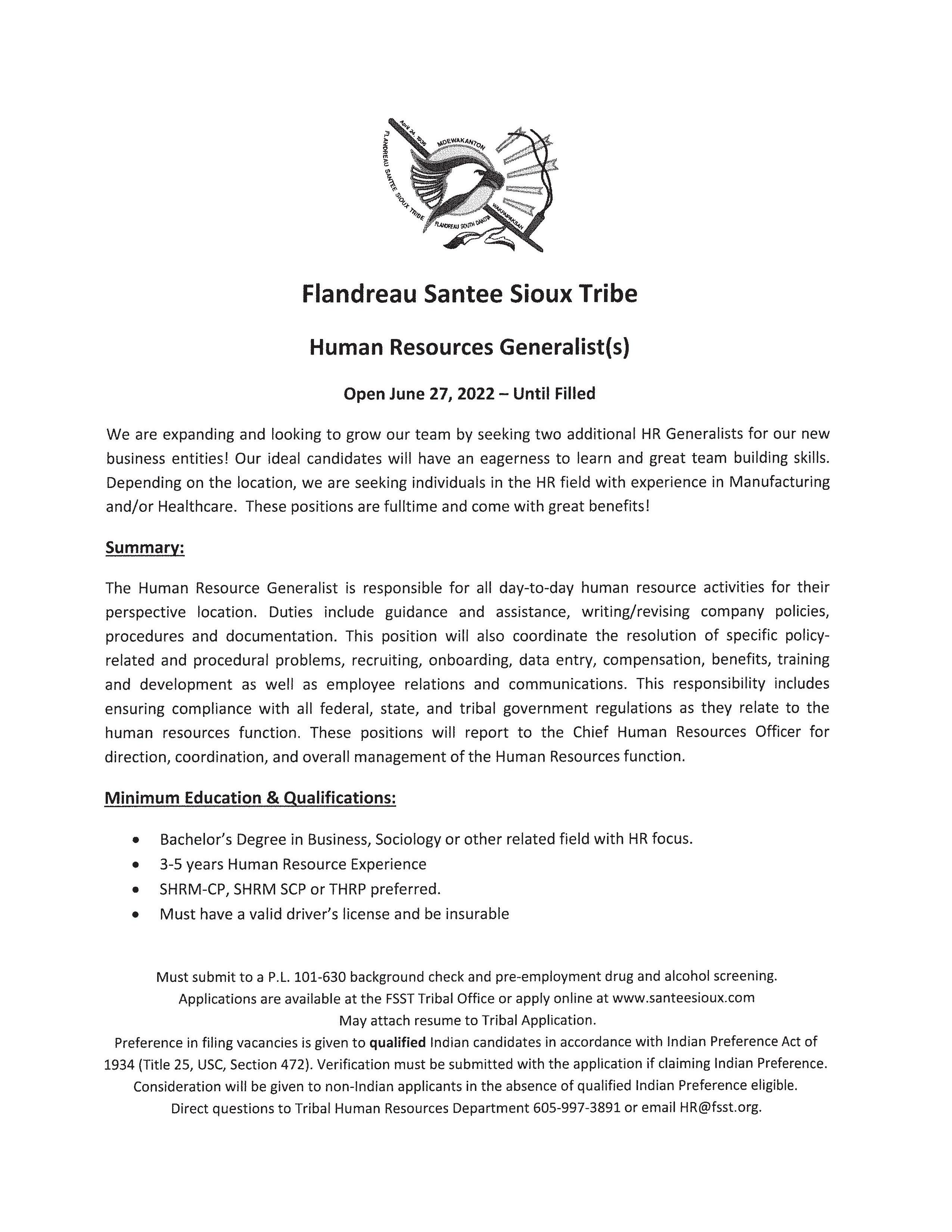 vacancies is given to qualified Indian candidates in accordance with Indian Preference Act of 1934 (Title 25, USC, Sec?on 472). Verifica?on must be submiHed with the applica?on if claiming Indian Preference. Considera?on will be given to non-Indian applicants in the absence of qualified Indian Preference eligible. Direct ques?ons to Tribal Human Resources Department 605-997-3891 or email HR@fsst.org.