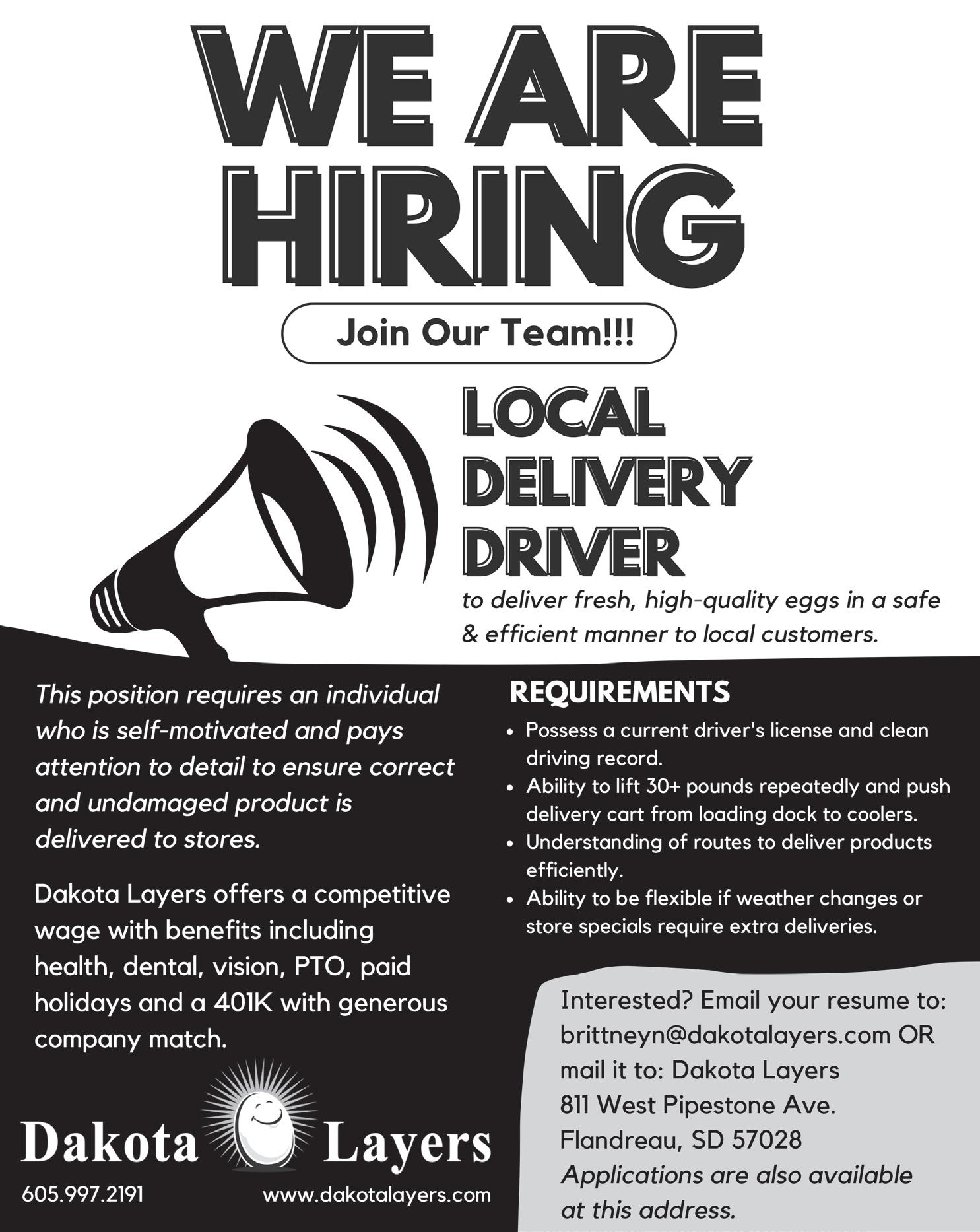 Brookings, Madison Adrian, Lamberton, Leota, Luverne, Marshall, Pipestone, Slayton, Tyler NOW HIRING 507-829-8150 Class A or Class B drivers Competitive Wage • Benefits