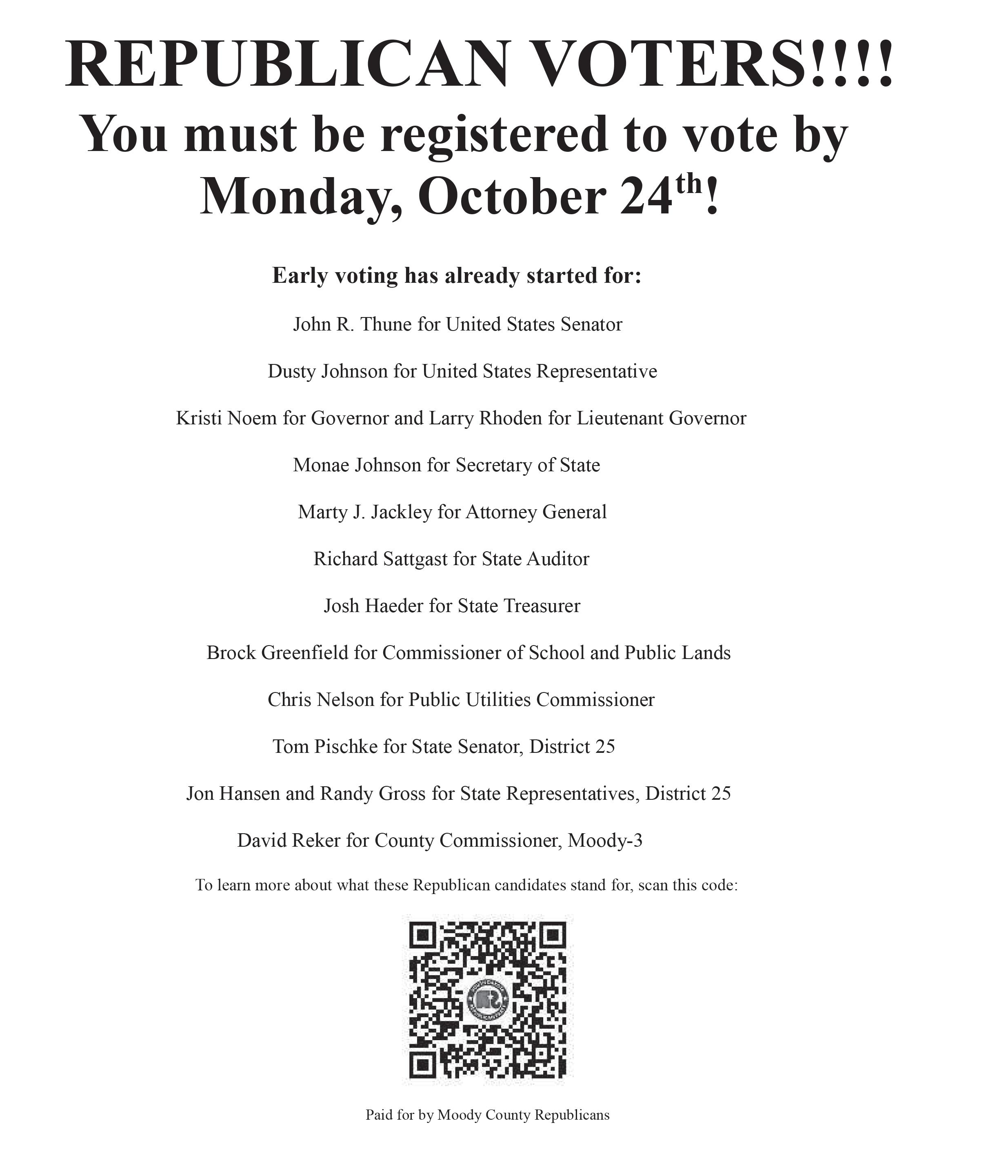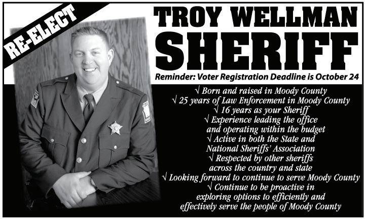 PAGE 2 Booster “We’ve Got You Covered ~ Since 1955”• Wednesday, October 19, 2022 GROOTWASSINK Kris RE-ELECT MOODY COUNTY REGISTER OF DEEDS • Current Register of Deeds • 8 plus Years Experience in the Register of Deeds Office • Certified official through the South Dakota Association of County Officials continueing Education Program • Vote for experience, honesty, integrity and an excellent work ethic I am very proud to be able to Serve the Residents of Moody County and would very much appreciate your Vote on November 8th. Thank You !! Ad placed and paid for by Kris Grootwassink