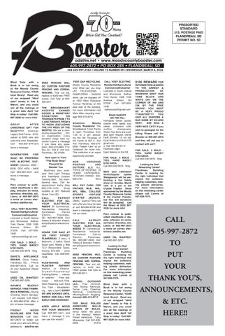 DEADLINE FOR THE BOOSTER. Call 605997-2872 or better yet email your ads and billing address to ads@iw.net