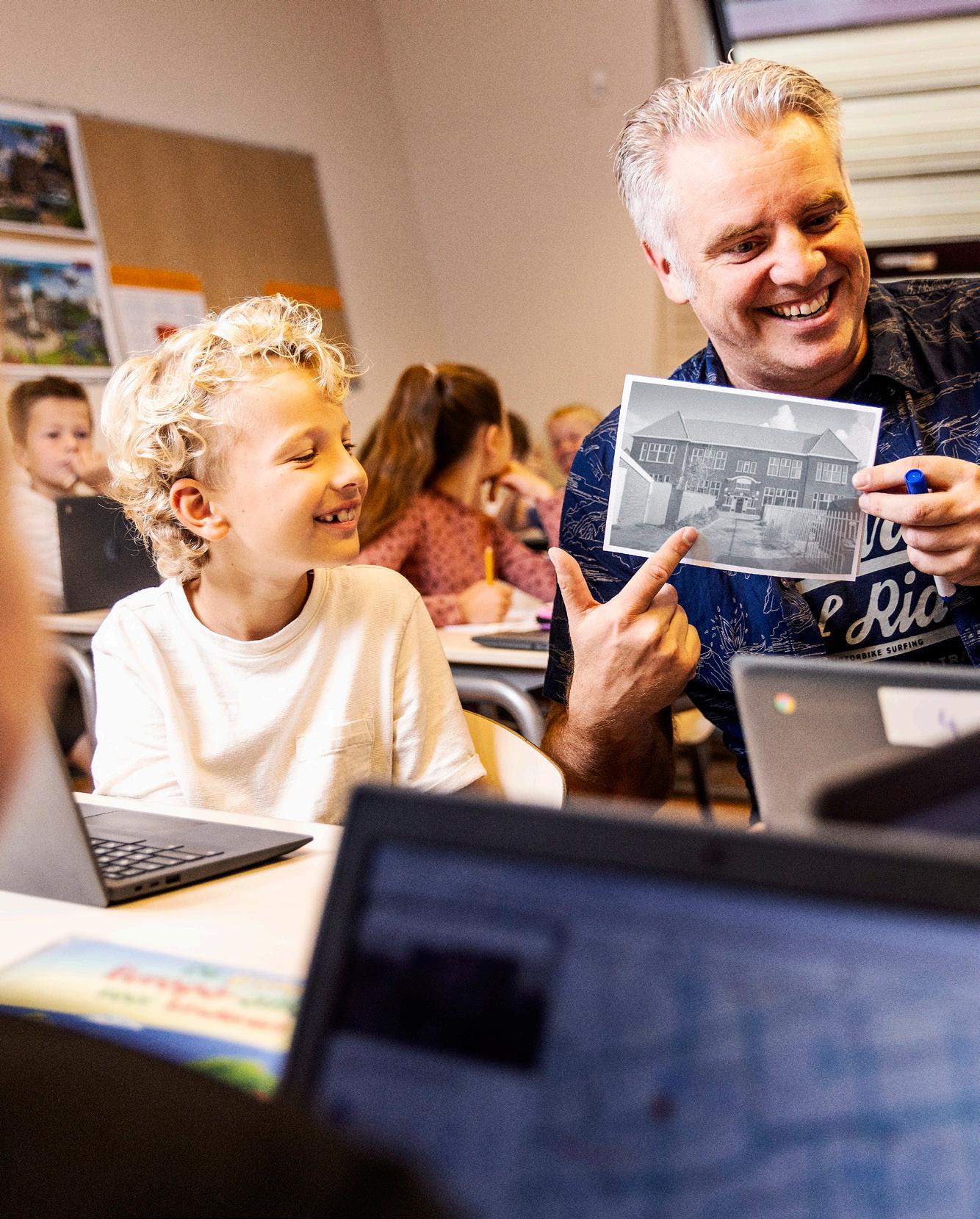 Datzelfde verleden, tradities en de grond waarop de school staat, reflecteert ook in de lessen. “We houden vast aan waarden zoals ‘waar ieder kind telt en al doende leert’ en geven traditioneel onderwijs. Met de methodes van nu. We hebben Chromebooks en een leerlijn digitale geletterdheid. Zo werken de kinderen met Bee-Bots, robotjes die opdrachten kunnen uitvoeren. Nieuwe methodes blijven komen, maar wat nooit verandert is onze visie op het vakmanschap van de leerkracht. Dat is de basis voor goed onderwijs. Daaromheen bouwen we wat het kind nodig heeft”, zegt Bregje. Startende leerkrachten en ervaren rotten in het vak staan garant voor lessen van hoge kwaliteit. Het doorgeven van kennis en ervaring loopt door alle groepen heen. “Zo leiden we eerstejaars Pabo-studenten op voor het vak vanuit opleidingsschool Talentum Haagland. Alle elementen zorgen ervoor dat dit een plek is waar kinderen zich in een fijne sfeer kunnen ontwikkelen, geïnspireerd door de waarden van het verleden en klaar voor de wereld van morgen.”