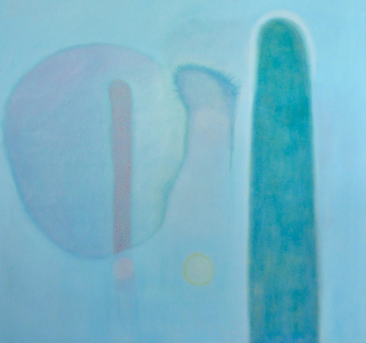 Standing stones, mountains, obelisks, shards of light — these are our connection with the sky, with the heavens and with the ethereal world. Often on top of these connecting shapes, is a corona or crown of energy, symbolising enlightenment, a boundary between the profane and the sublime — or more mundanely, a paddock fence or aerial. These paintings represent life, all life, not just human, not just animate or visible, but that of animal, plant and stone. The spheres circling mysteriously above us in space, space itself, this whole conglomerate of wonder and joy that is our life. In the end, we are all luminous.