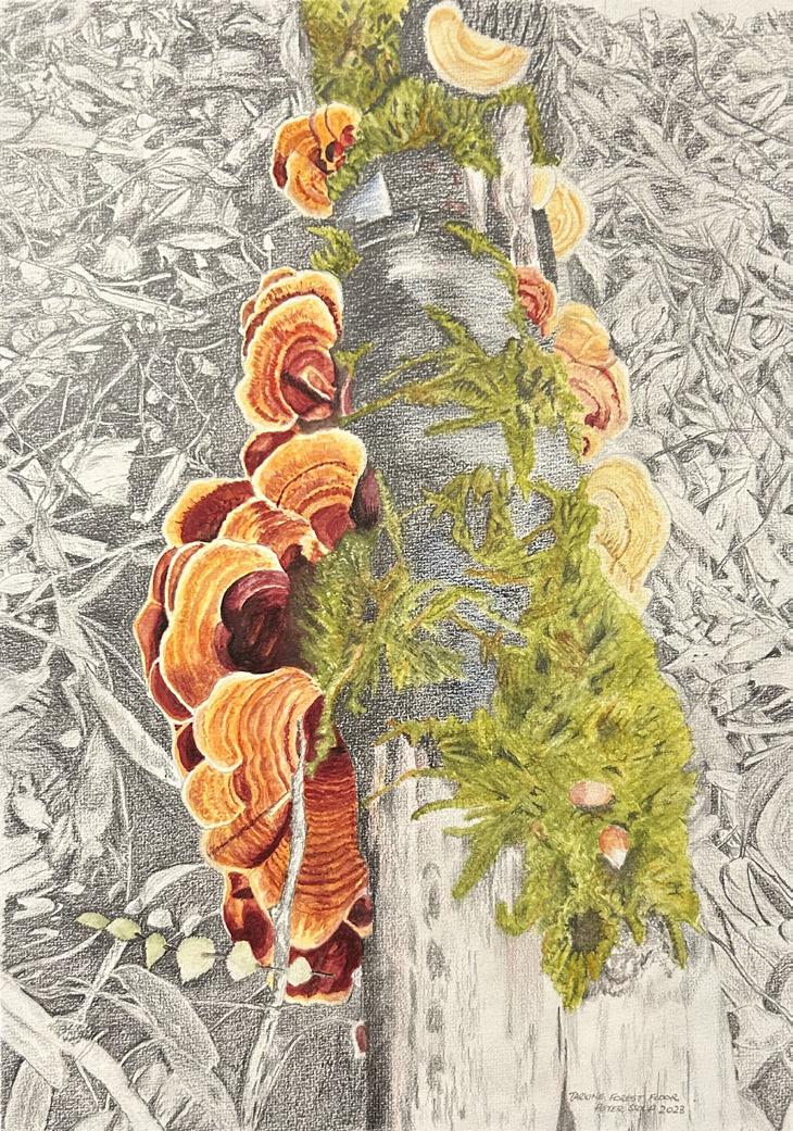 Working with layered Japanese Kozo paper, Cheryl overlays hand rendered, etched, frottaged and printed images reflecting the intricacies of the coastline she calls home.