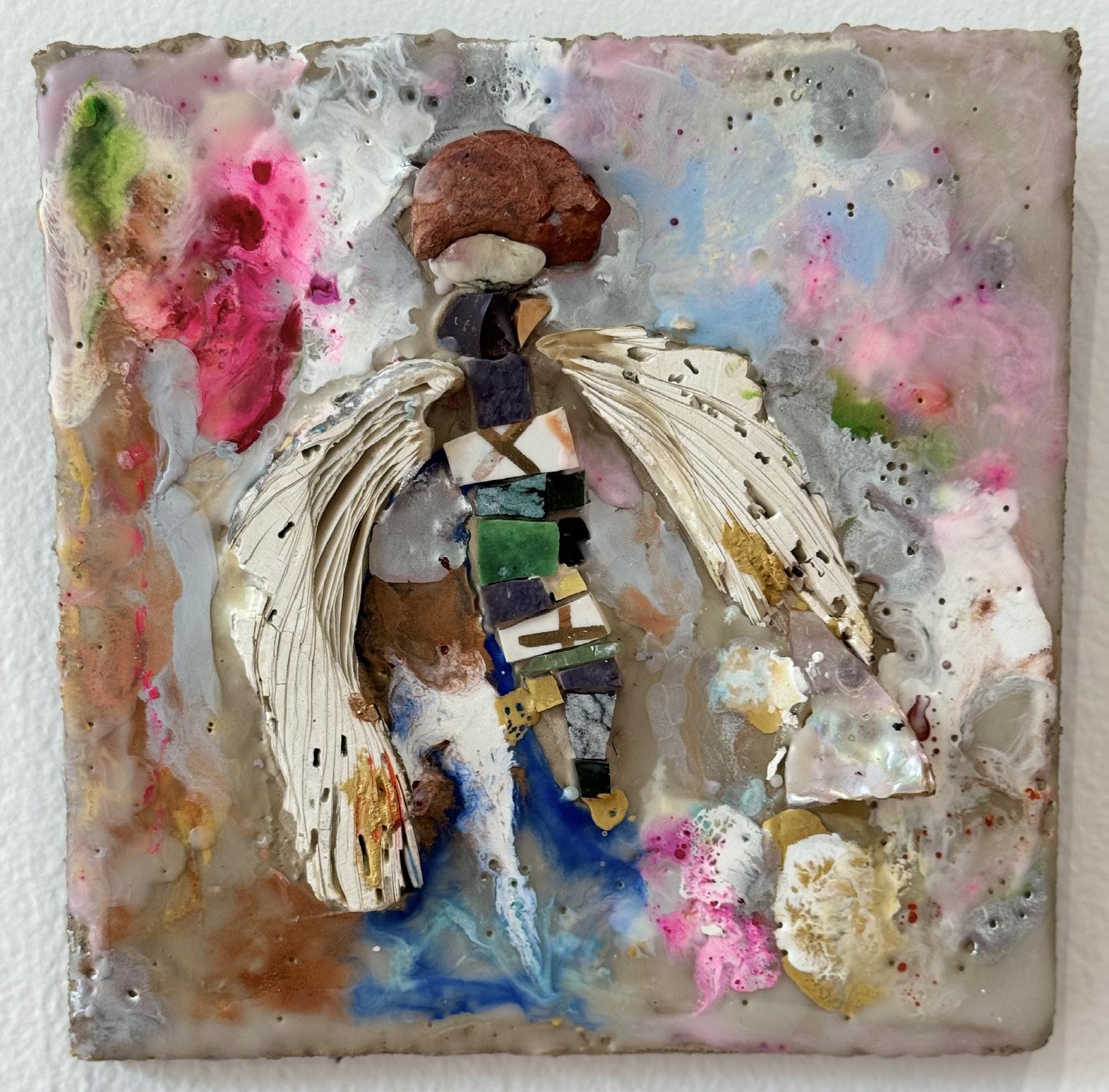 The Angels emerge from mosaic and encaustic practices and are the result of a unique collaboration between the two artists, Sue Leitch and Noula Diamantopoulos. Each angel is unique, created through an interactive process, driven by the materials and the artists’ response to them.