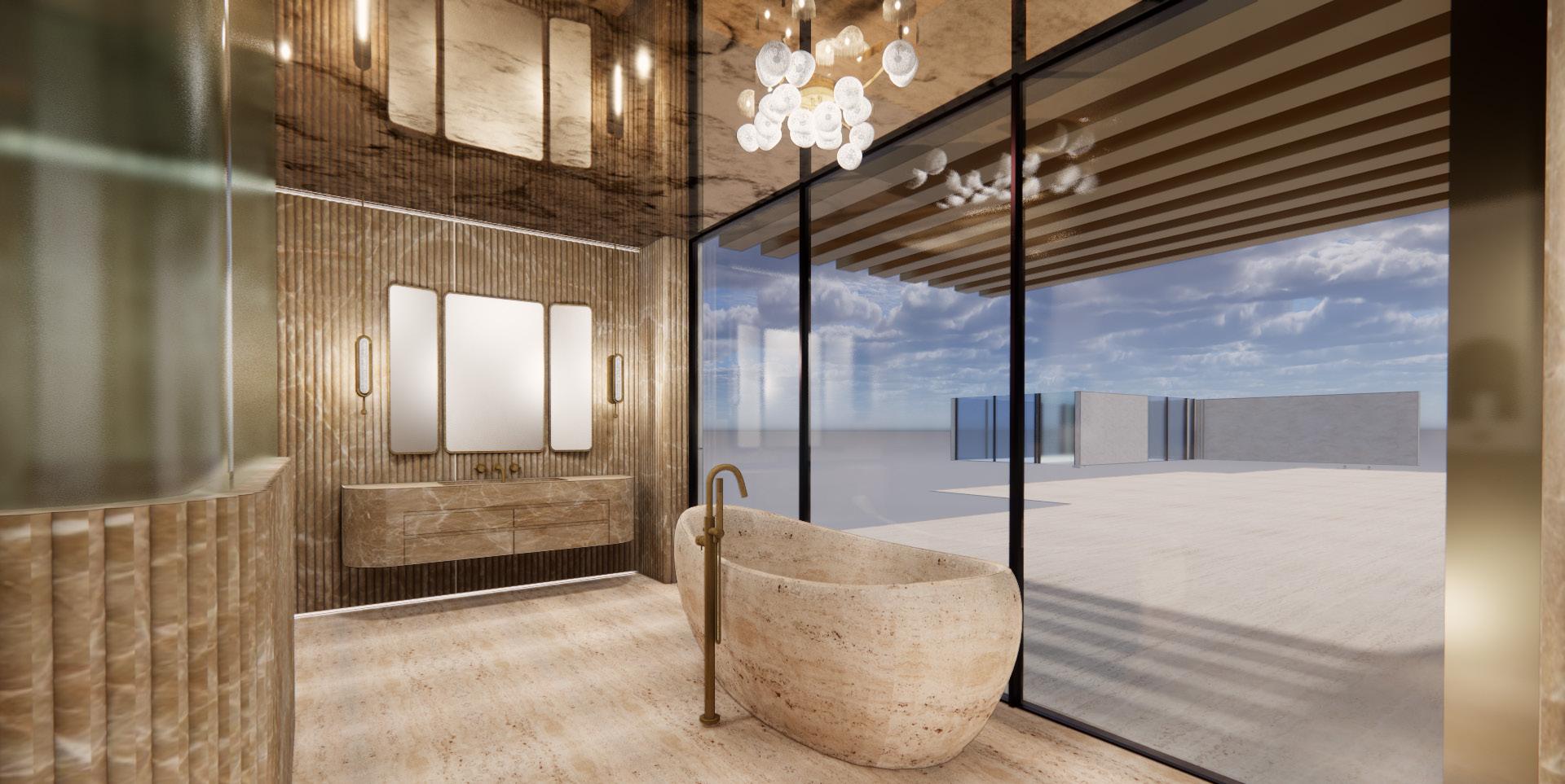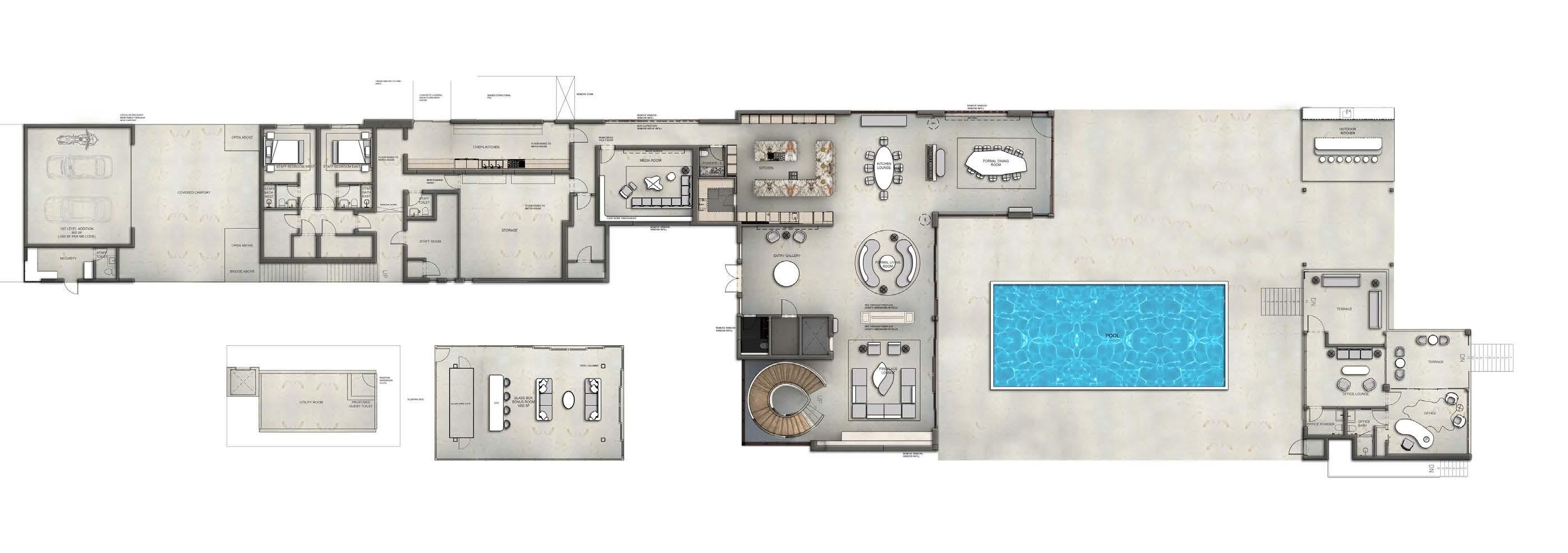 HAAG has designed all interior architecture of the space (all main living and dining spaces, kitchen, media room, bathrooms, master bed and closet, spa, and gym) and all indoor and outdoor furniture, lighting and fixtures. Materials in project consist of: limestone, plaster, travertine, marble and onyx slabs,