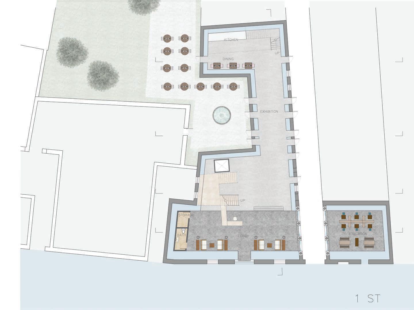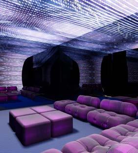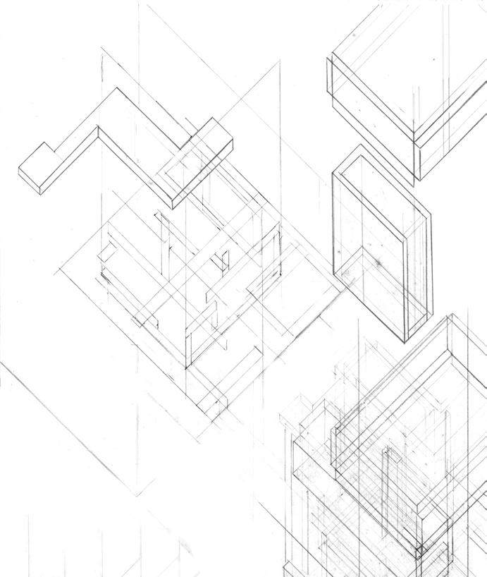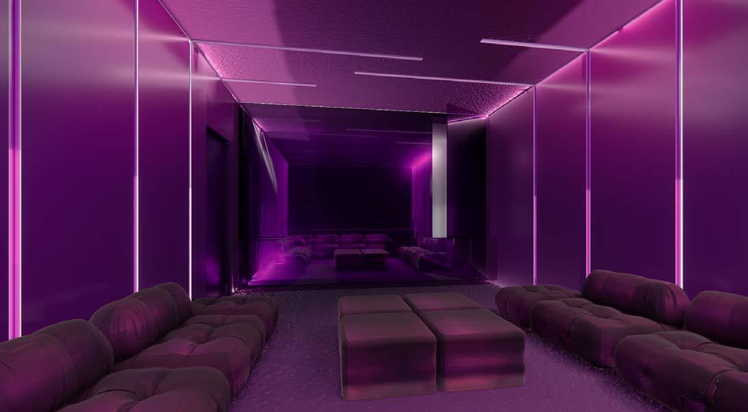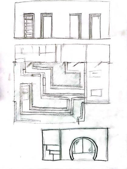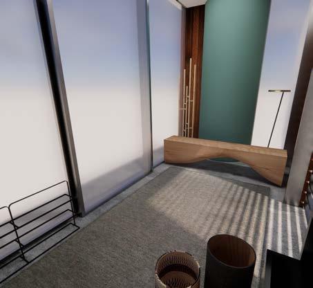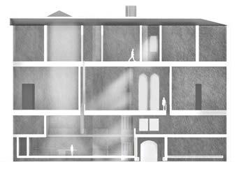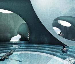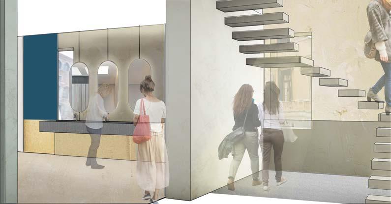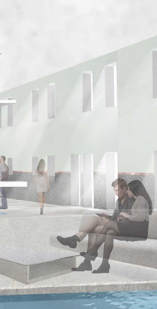 through the space. Hotel guests can look through these tunnels and see the water stream bellow. The material moves from a heavy stereoscopic to a light and tectonic, mimicking the feeling of being lifted up when you look at the sky’s of Venice while walking its narrow streets.