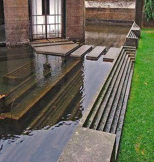 on the side of the building and pouring into the outdoor garden. The water is then used for gray water systems in the space and as well as ventilation. When the hot air enters the space and hits the water stream it cools down and as it heats again it rises and leaves the space through vertical tunnels created