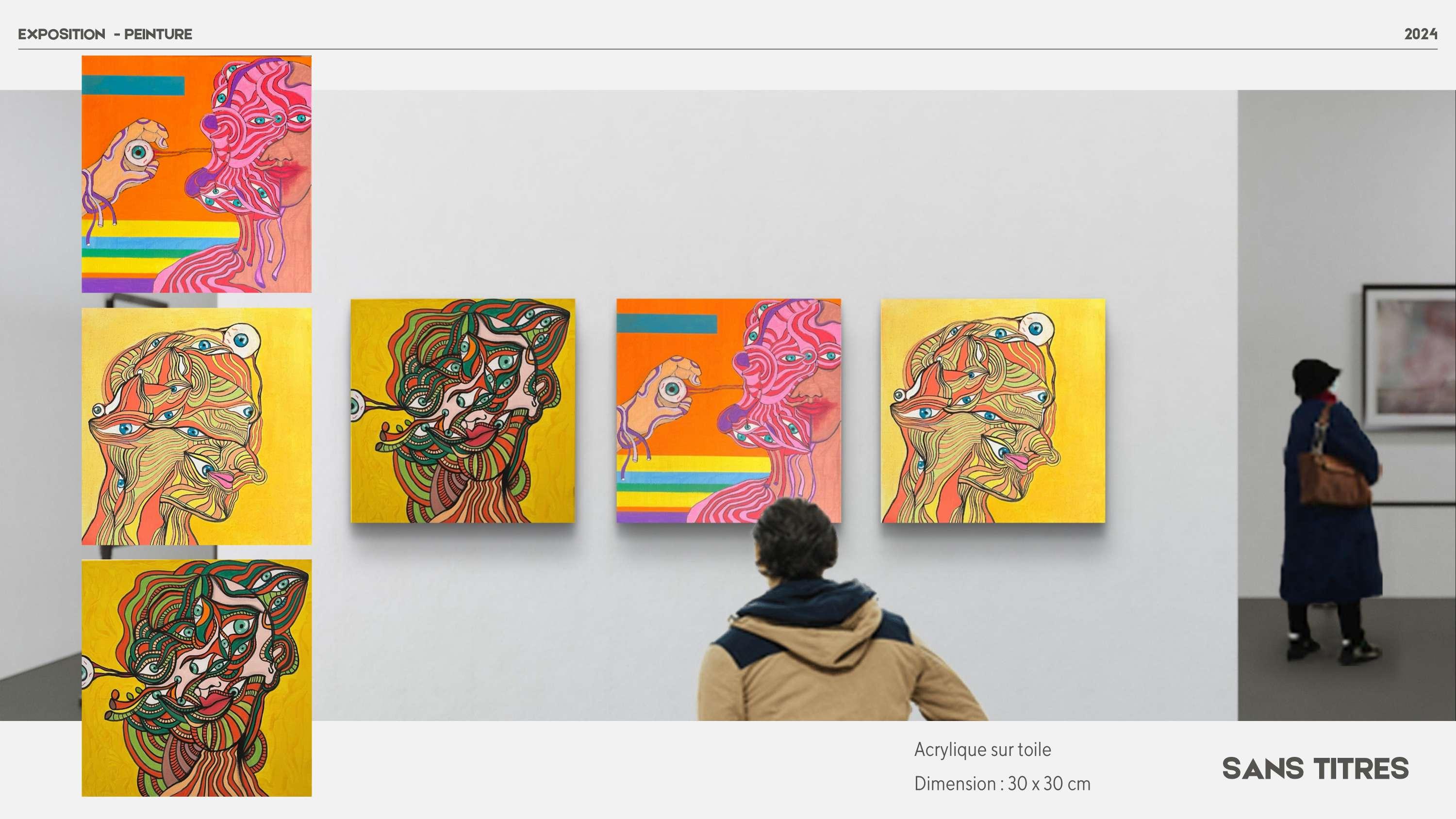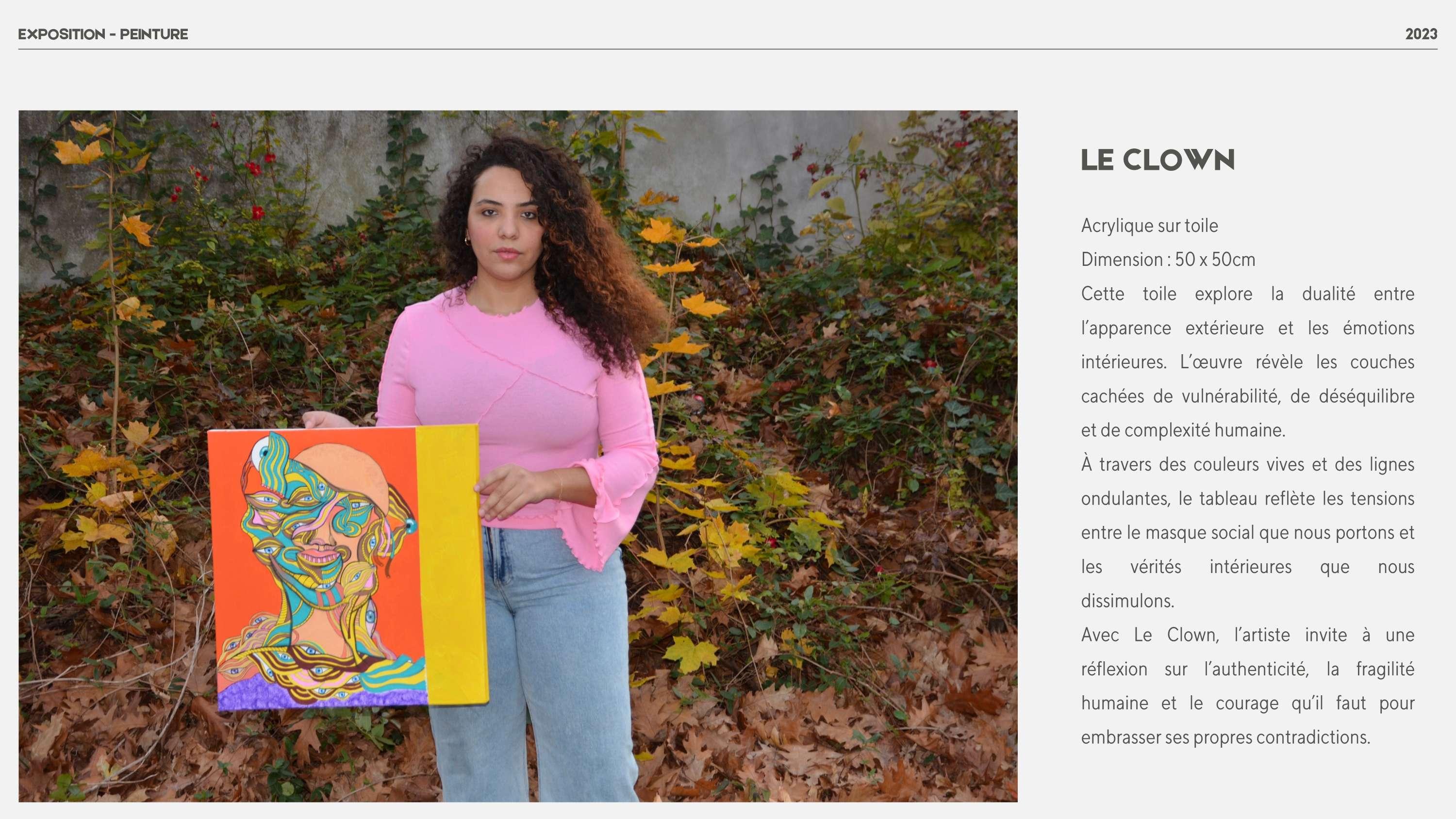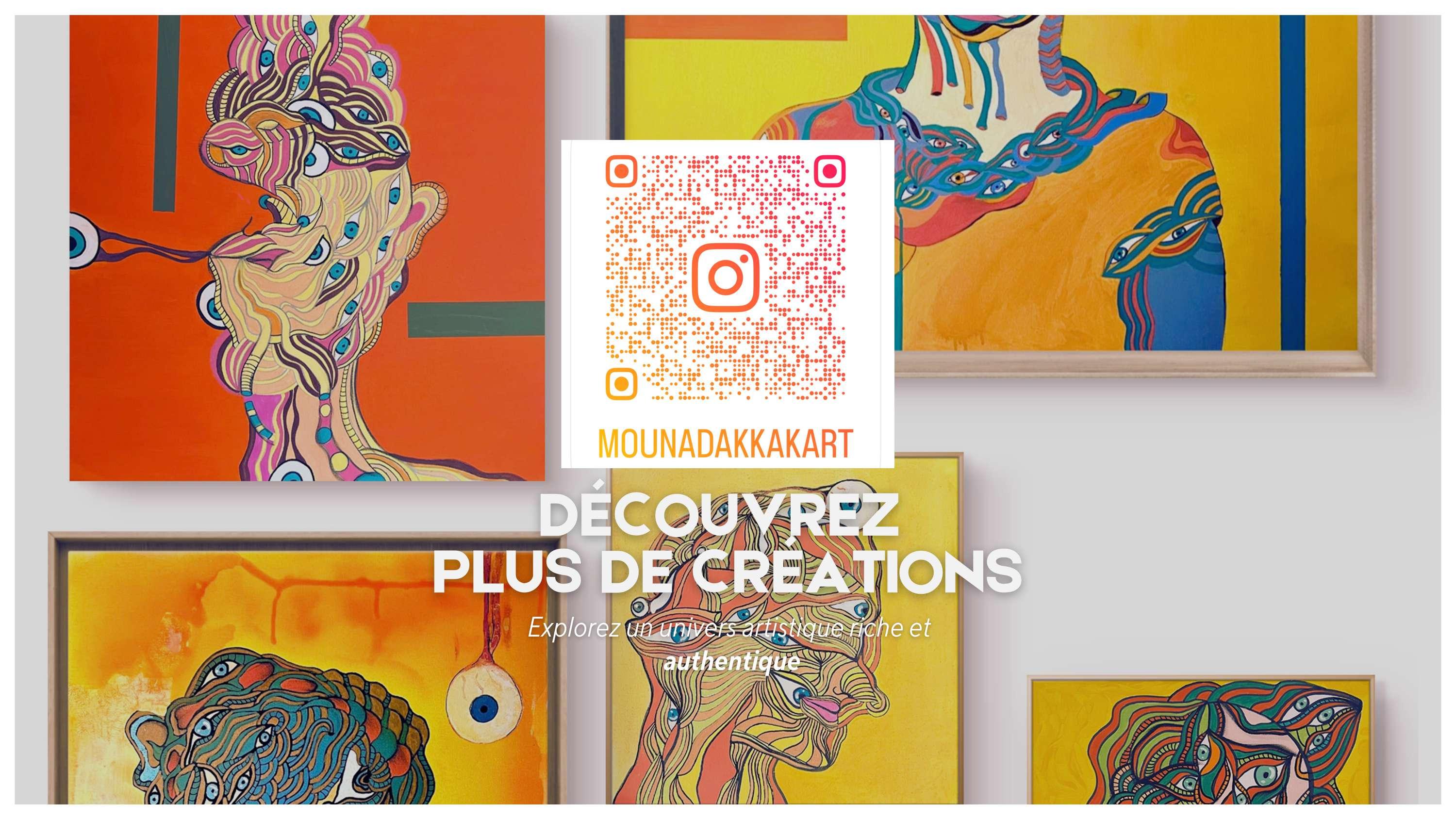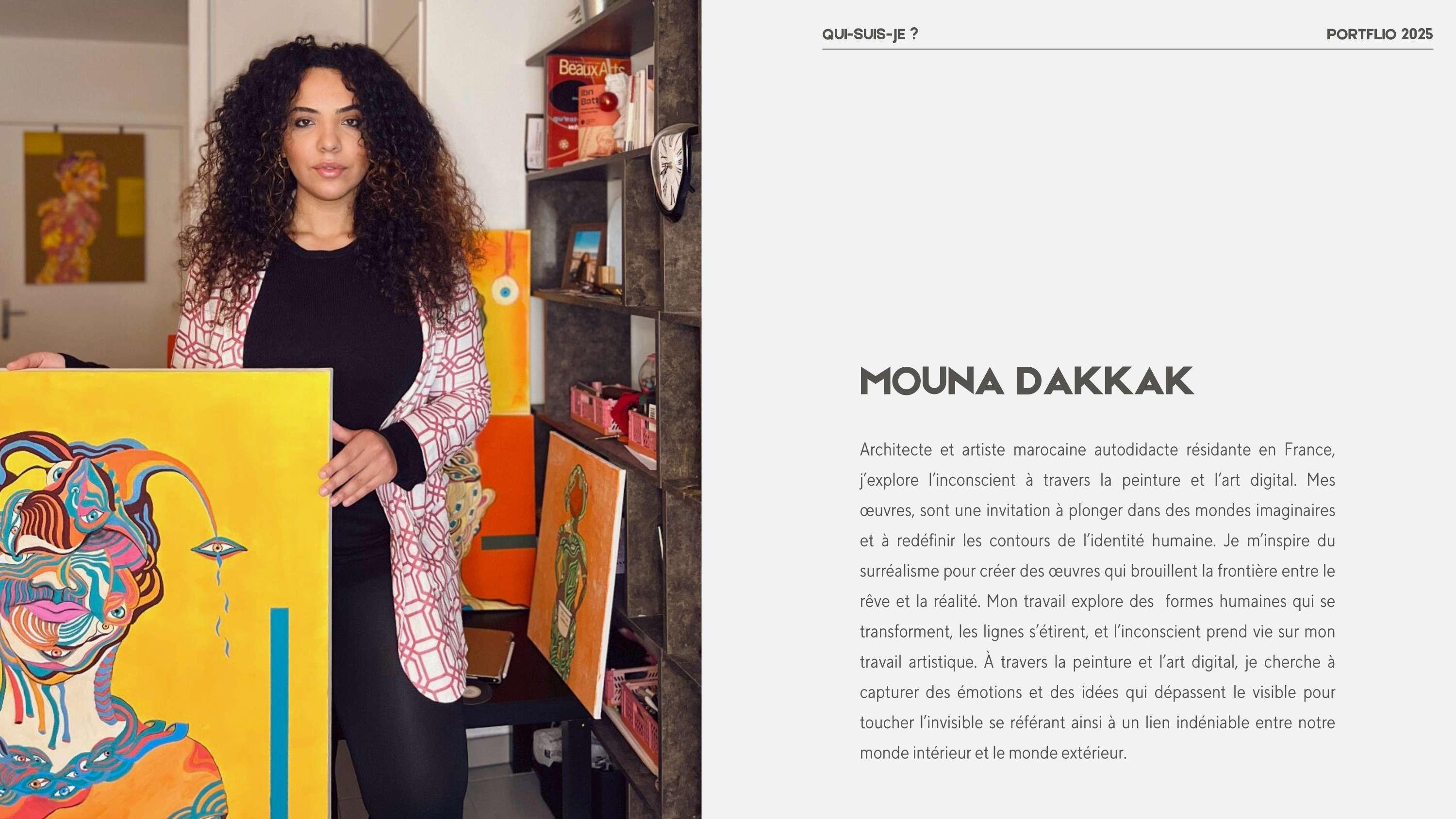 Mouna Dakkak, artiste visuelle basée dans la région lyonnaise et de formation architecte, explore à travers son travail les dimensions émotionnelles et sociales des portraits. Inspirée par le surréalisme, elle développe une pratique artistique hybride, mêlant l’acrylique sur toile, le dessin digital sur tablette et des créations sur divers supports comme le textile, les objets décoratifs et les accessoires.