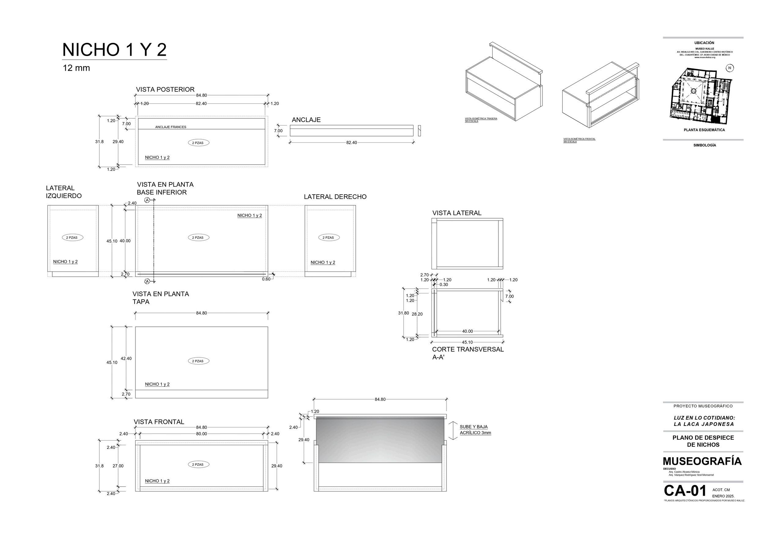 Sala única, compuesta por tres nichos que en su interior resguardan piezas elaboradas con la técnica antigüa de enlacado japonés. Pensados y elaborados con el mismo sistema alusivo al almacenaje de cada obra.