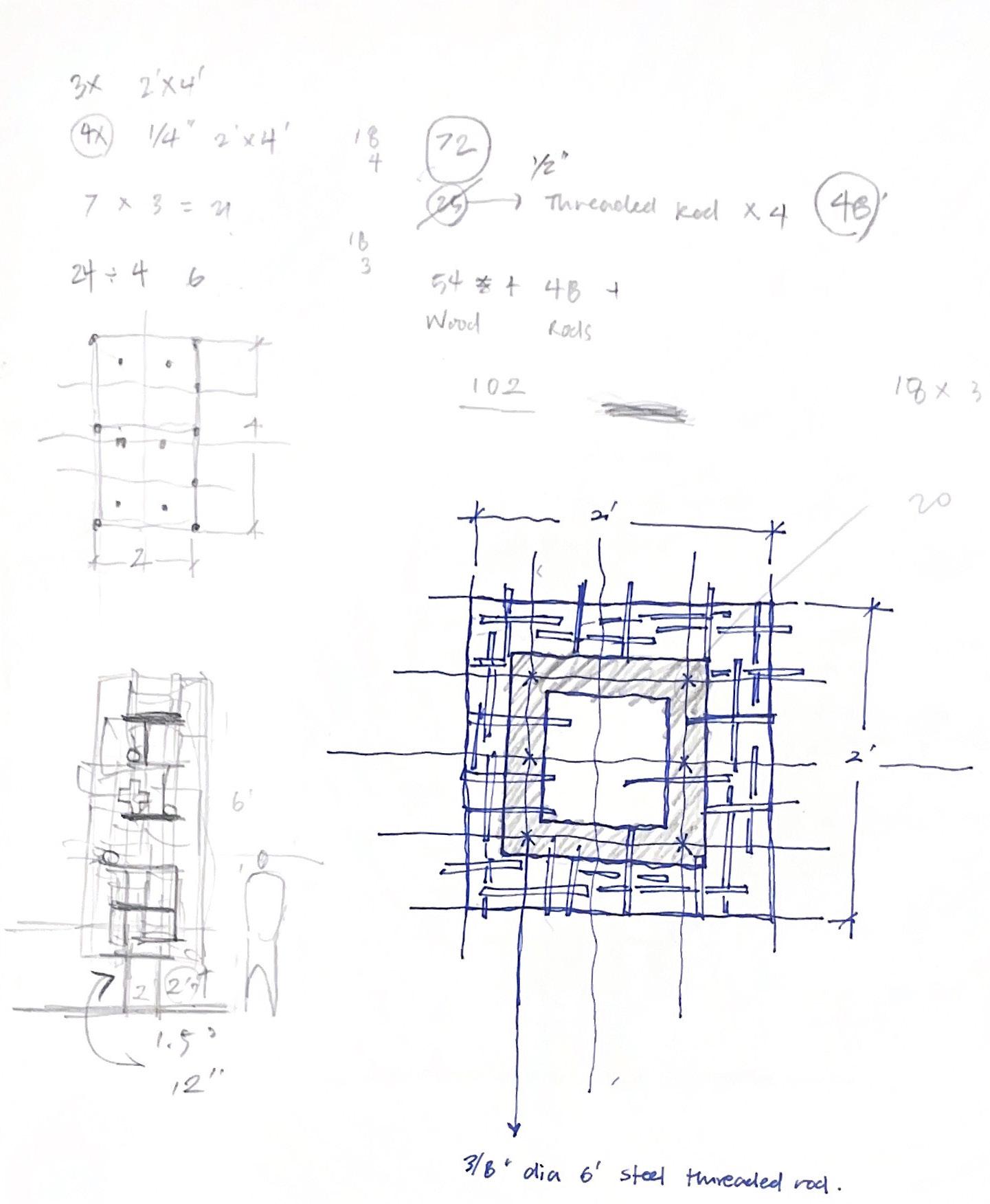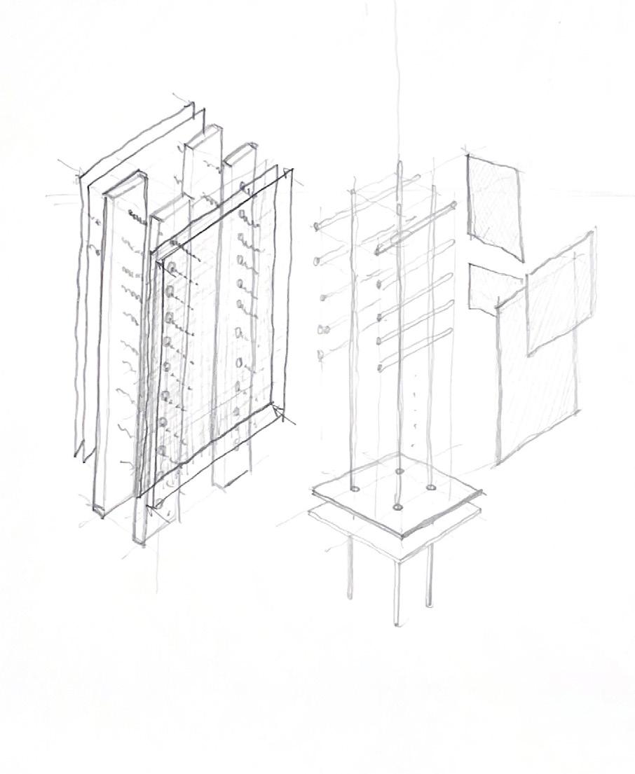• Individual panels have slits so that they interlock with eachother. Ten steel rods act as a structural core for the model.