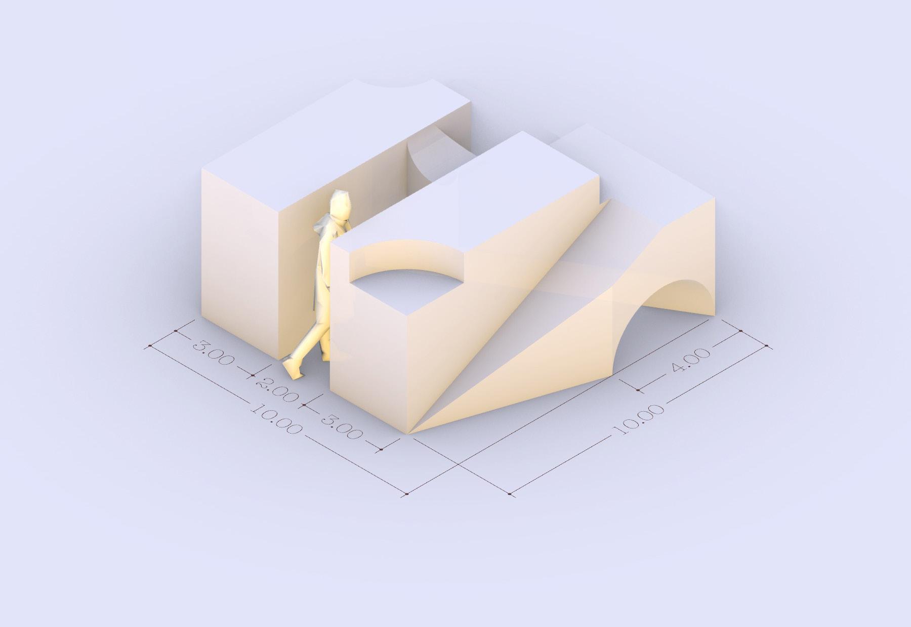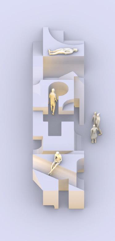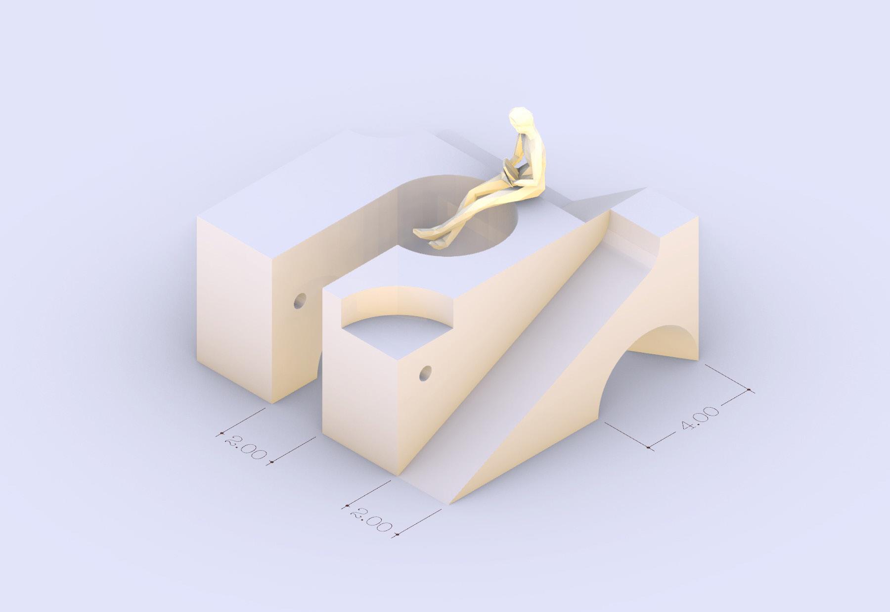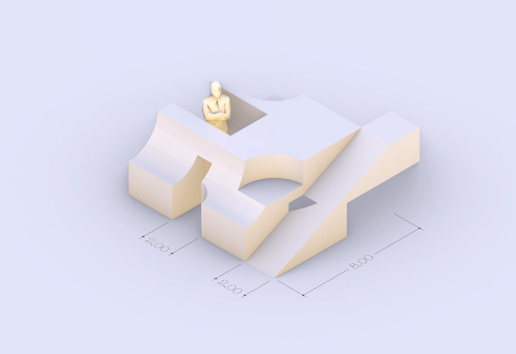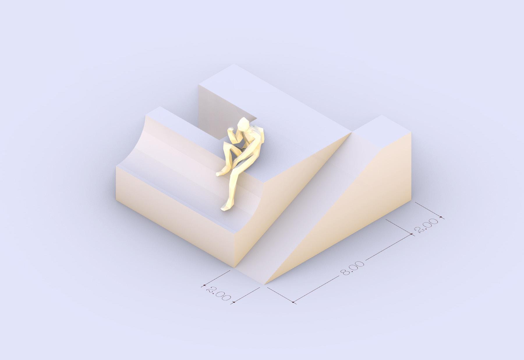 The odd slopes and curves of the objects also invite the visitors to not only sit and spend time together but have the accessibility to dynamically engage with one’s surroundings. This physical dynamism will further fuel a more active engagement within the visitors of the buildings at all times. The objects work together with their surrounding spaces and together create a space of mystery, blured boundaries, and of open interpretation.