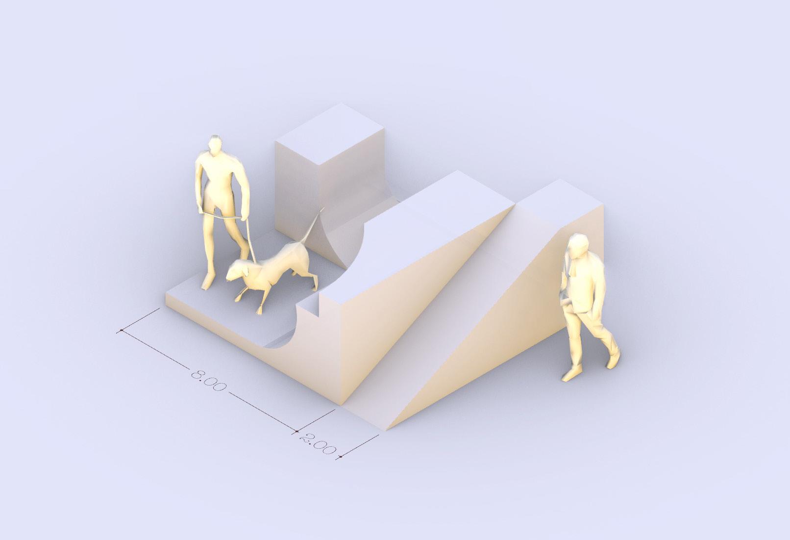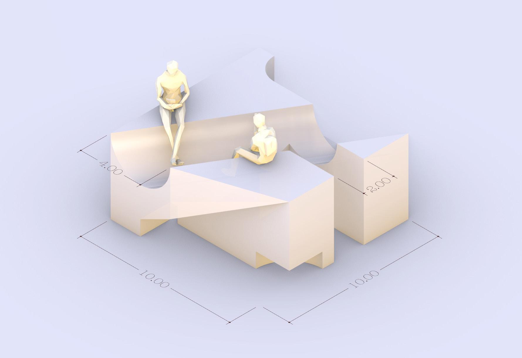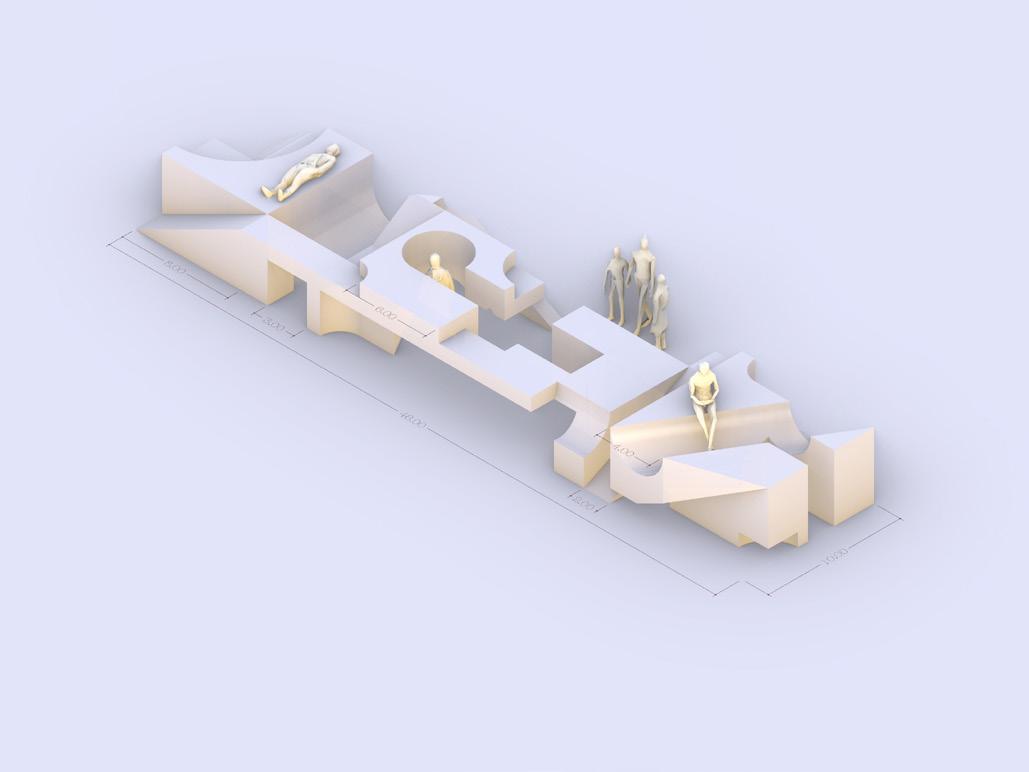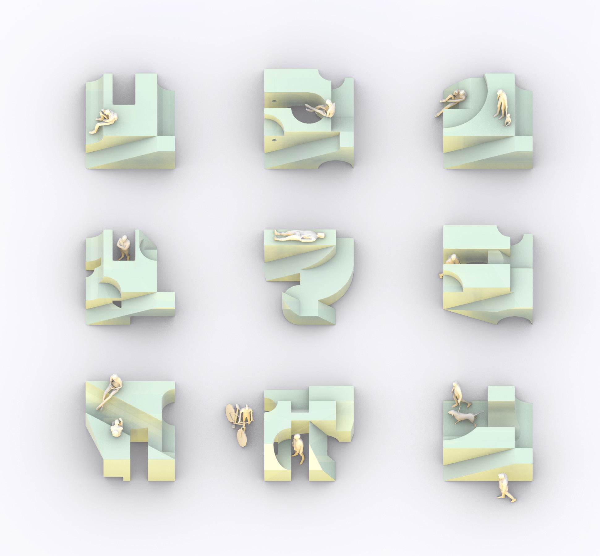 The nine ‘objects’ are cubic forms for a range of physical engagement in a personal and social setting. This formal study resulted in creating nine abstract furniture pieces, or mini playgrounds that have the potential to be scattered around a platform or landscape. The closer these individual objects are in relation to eachother, there is a higher chance of different goups of individuals mingling together to create new spontaneous relationships. The individual objects come together to form a landscape of mini playgrounds, enhancing a playful terrain open for possibilities.