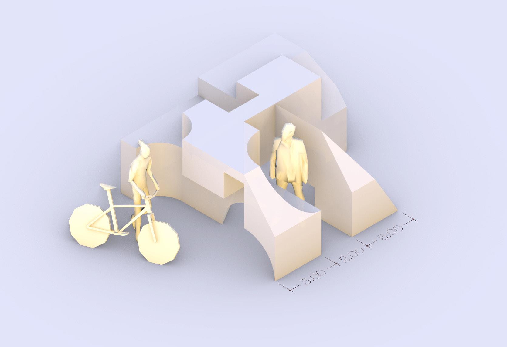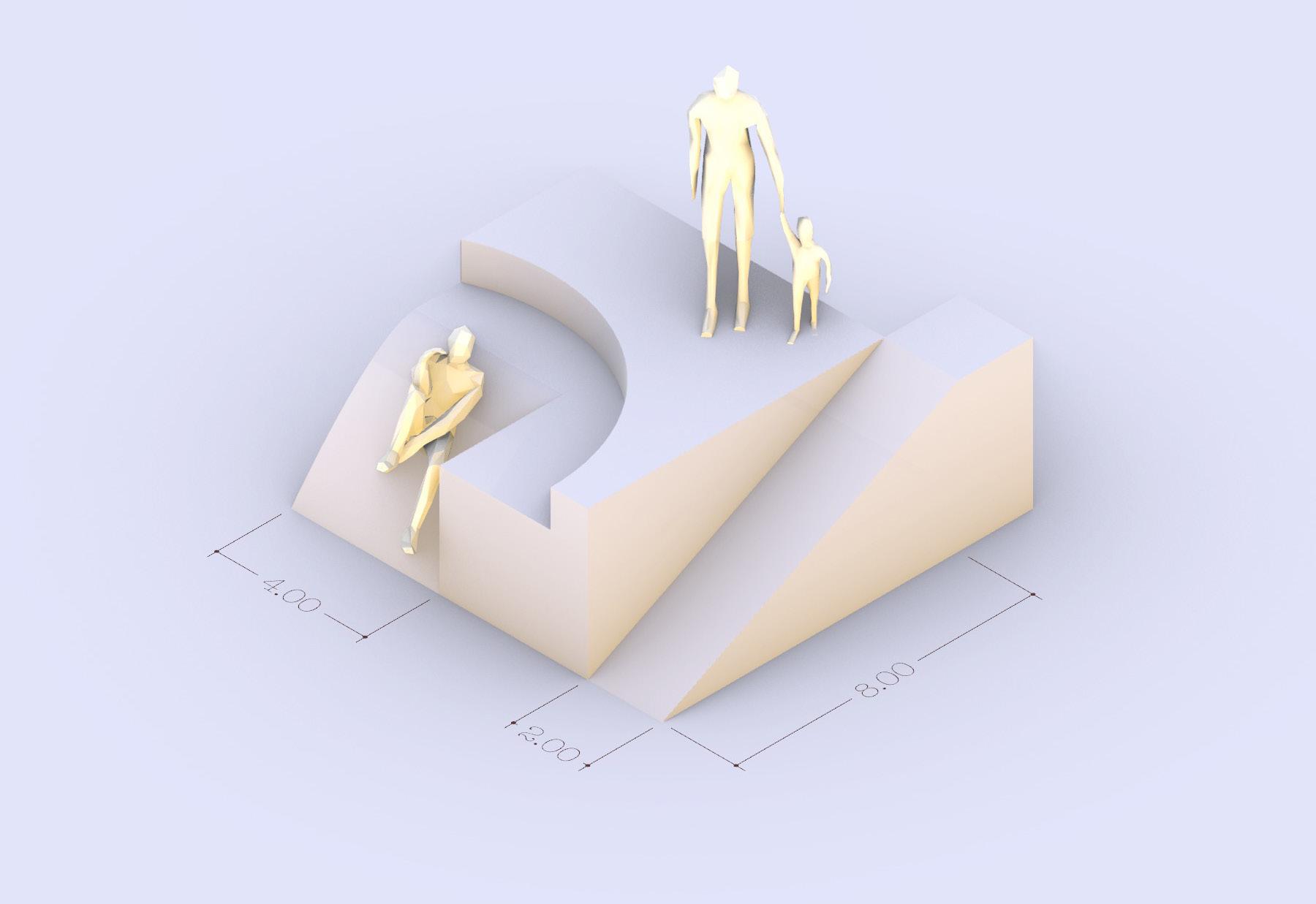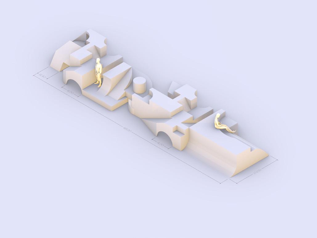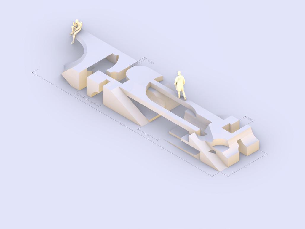 The nine ‘objects’ are cubic forms for a range of physical engagement in a personal and social setting. This formal study resulted in creating nine abstract furniture pieces, or mini playgrounds that have the potential to be scattered around a platform or landscape. The closer these individual objects are in relation to eachother, there is a higher chance of different goups of individuals mingling together to create new spontaneous relationships. The individual objects come together to form a landscape of mini playgrounds, enhancing a playful terrain open for possibilities.