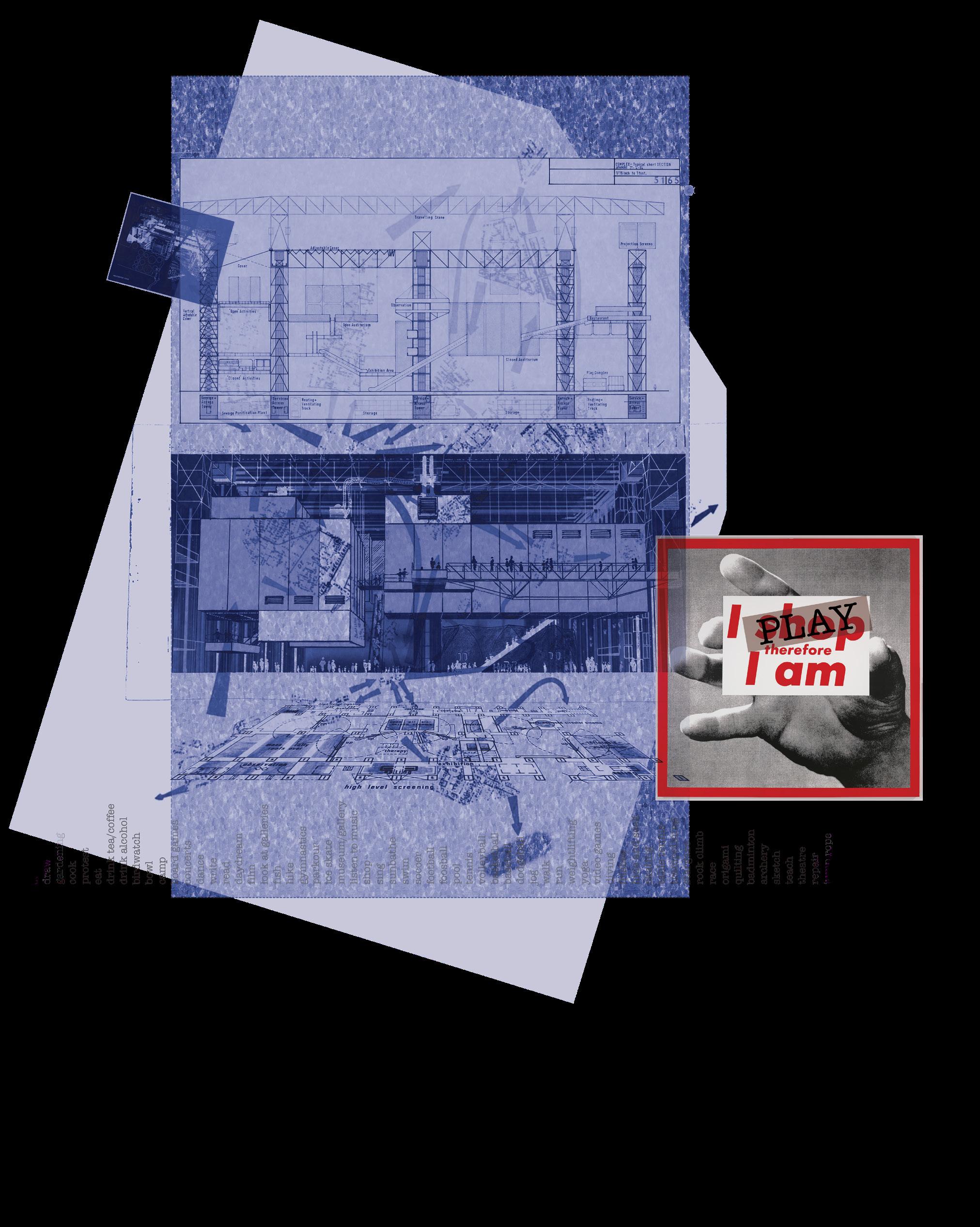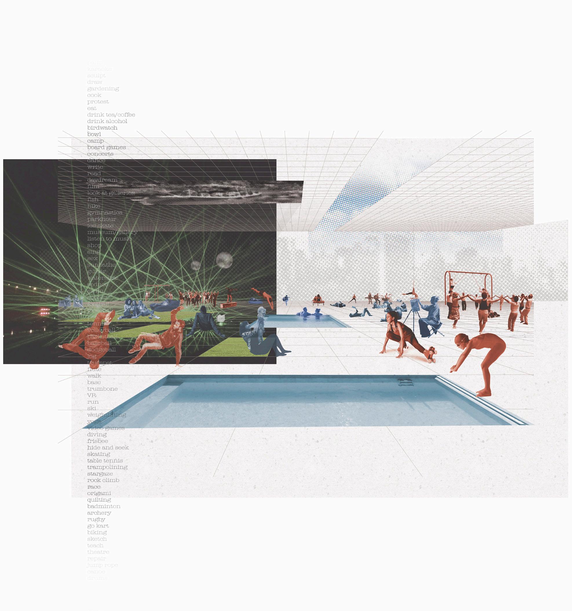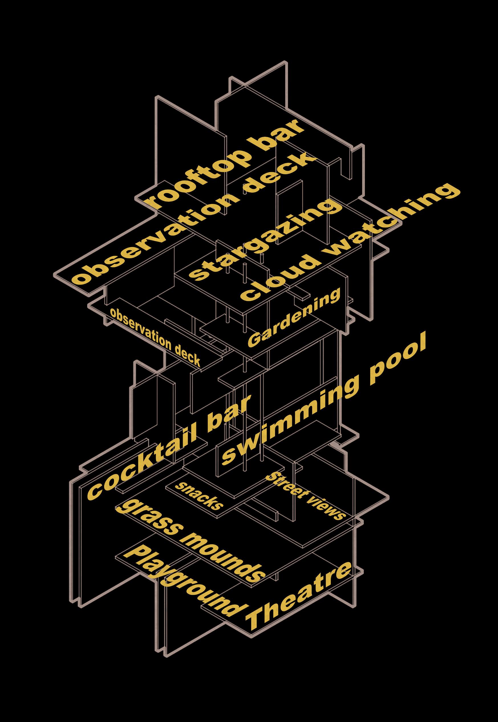 With the oppurtunity to experiment with projectors and projeection mapping, the technique is used to visualize a space with various programs juxtaposed with eachother, much like what Cedric Price’s Fun Palace wanted to achieve. Public spaces such as swimming pools and cocktail bars are adjacent to more reserved spaces such as places viewing the busy avenues of Manhattan or observation decks for cloud watching.