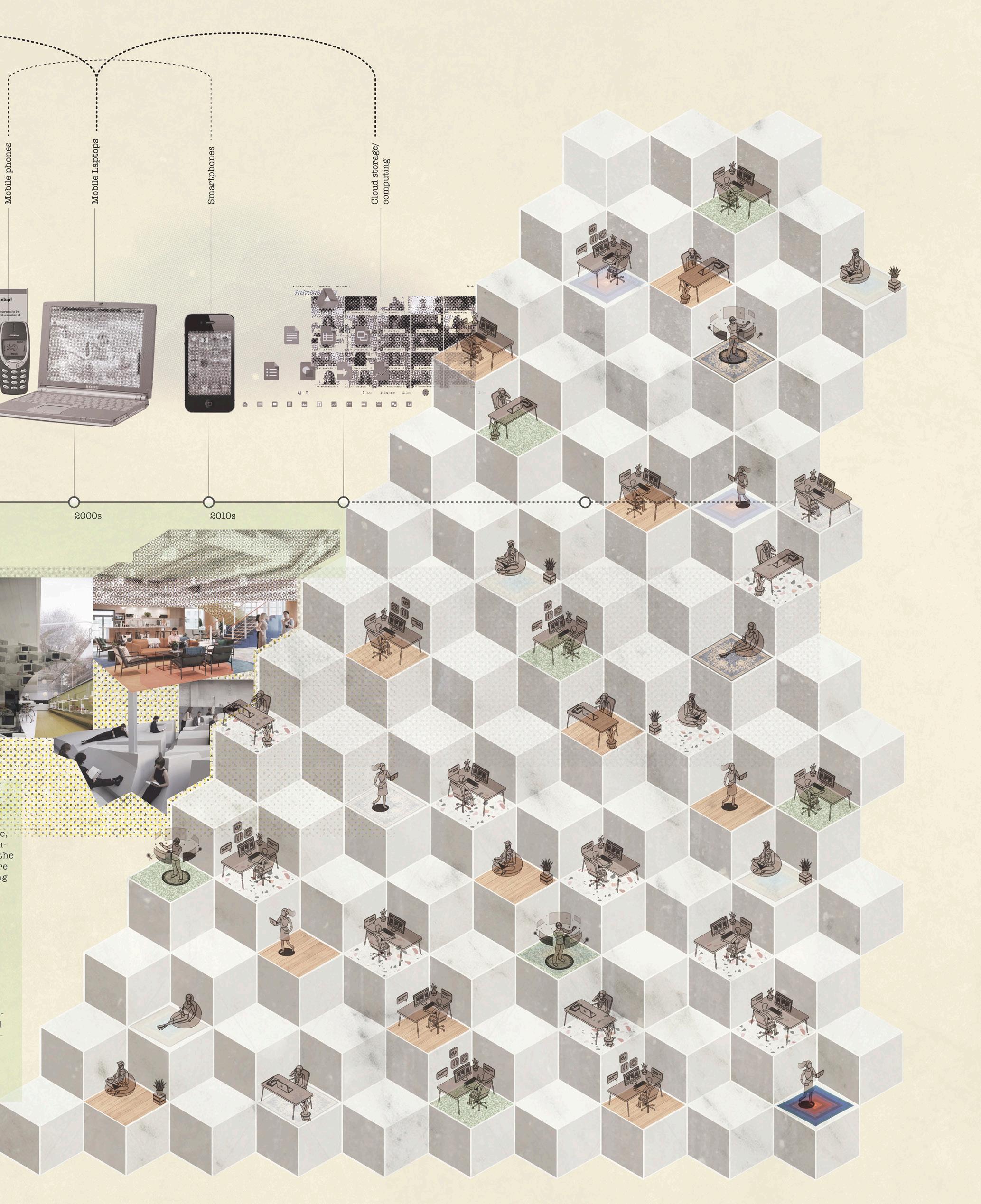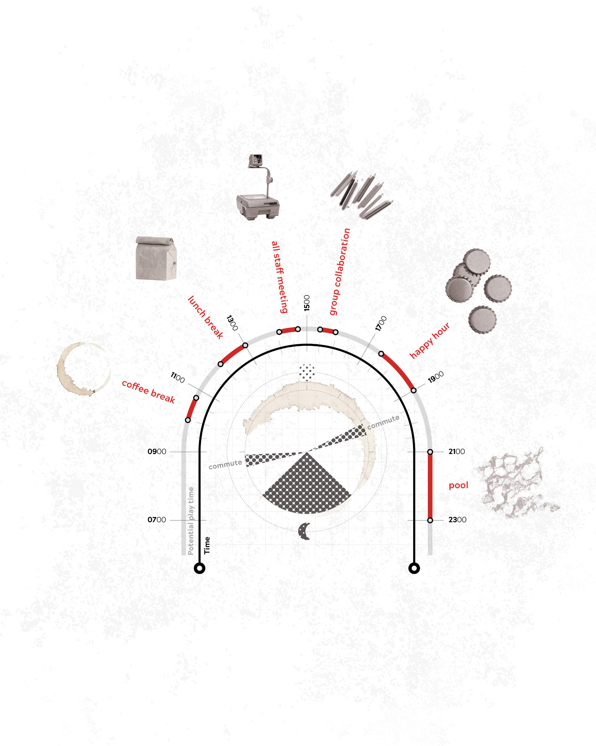 As work culture is shifting from fixed office spaces to flexible work schedules such as allowing half the week to work remotely, the necessity of public temporary workspaces will have high demands. The less rigid schedule and work environment allows space for breaks, and times of gathering that involves playful settings.