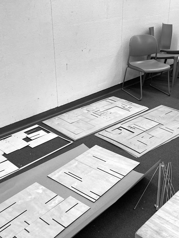 • With a laser cutter, quarter-inch birch plywood panels are cut to produce the various sizes of panels