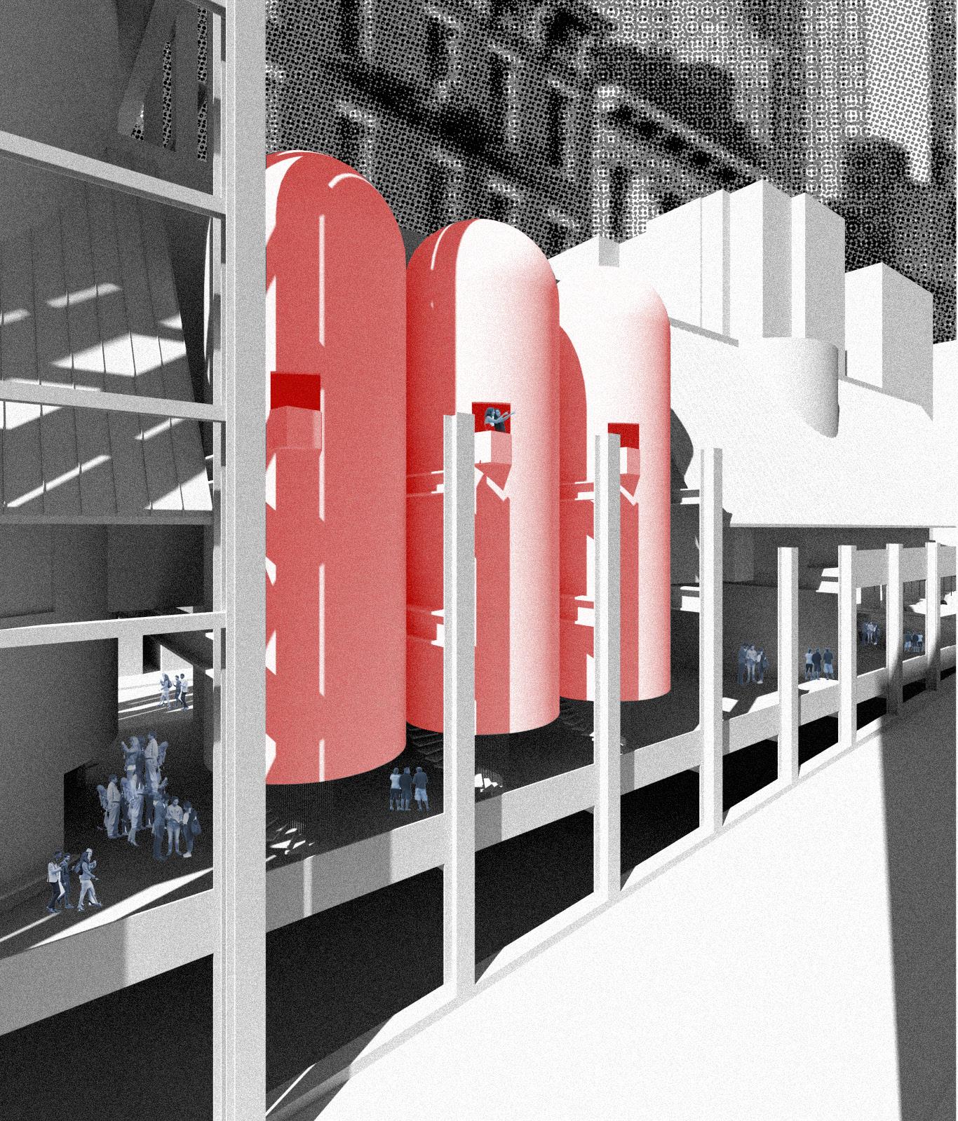 A number of interactive elements and spaces are scattered throughout the building and invites visitors to interact with the space. Visitors encounter giant floating cyliners that resemble silos in rural landscapes, and can react with the vertical space with sound. The silo’s responsive quality to sound unlocks a level of “open
