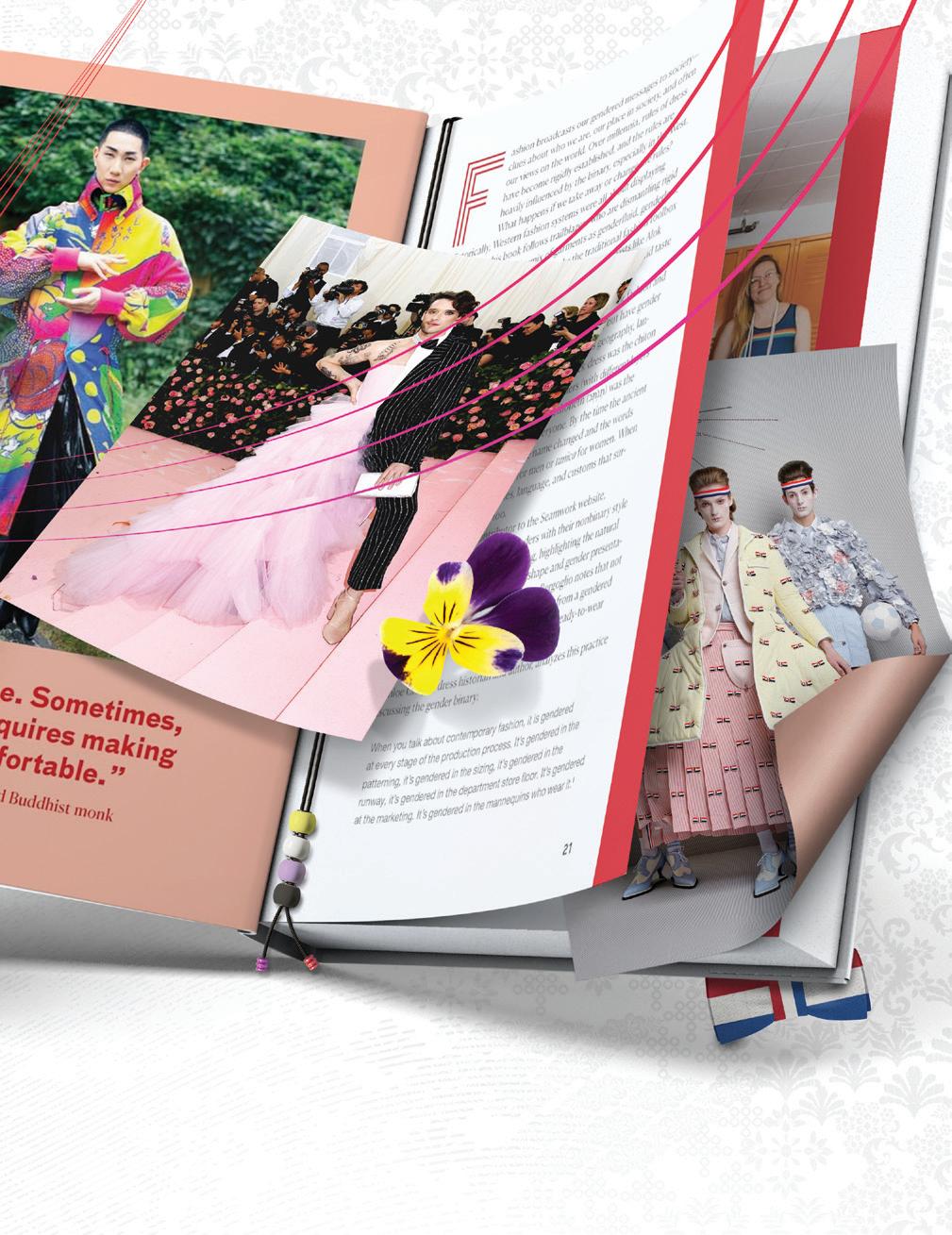 The inspiration for our book Bending the Rules: Fashion BeyondtheBinarycame from a deep passion for research— both Gwyn and I are costume designers as well as authors, so our creative process always starts with a costume designer’s curiosity. We soaked up research about how fashion, costume, clothing, and accessories reveal the full spectrum of gender identities. But as we began work on the book idea, everywhere we looked, the gender binary