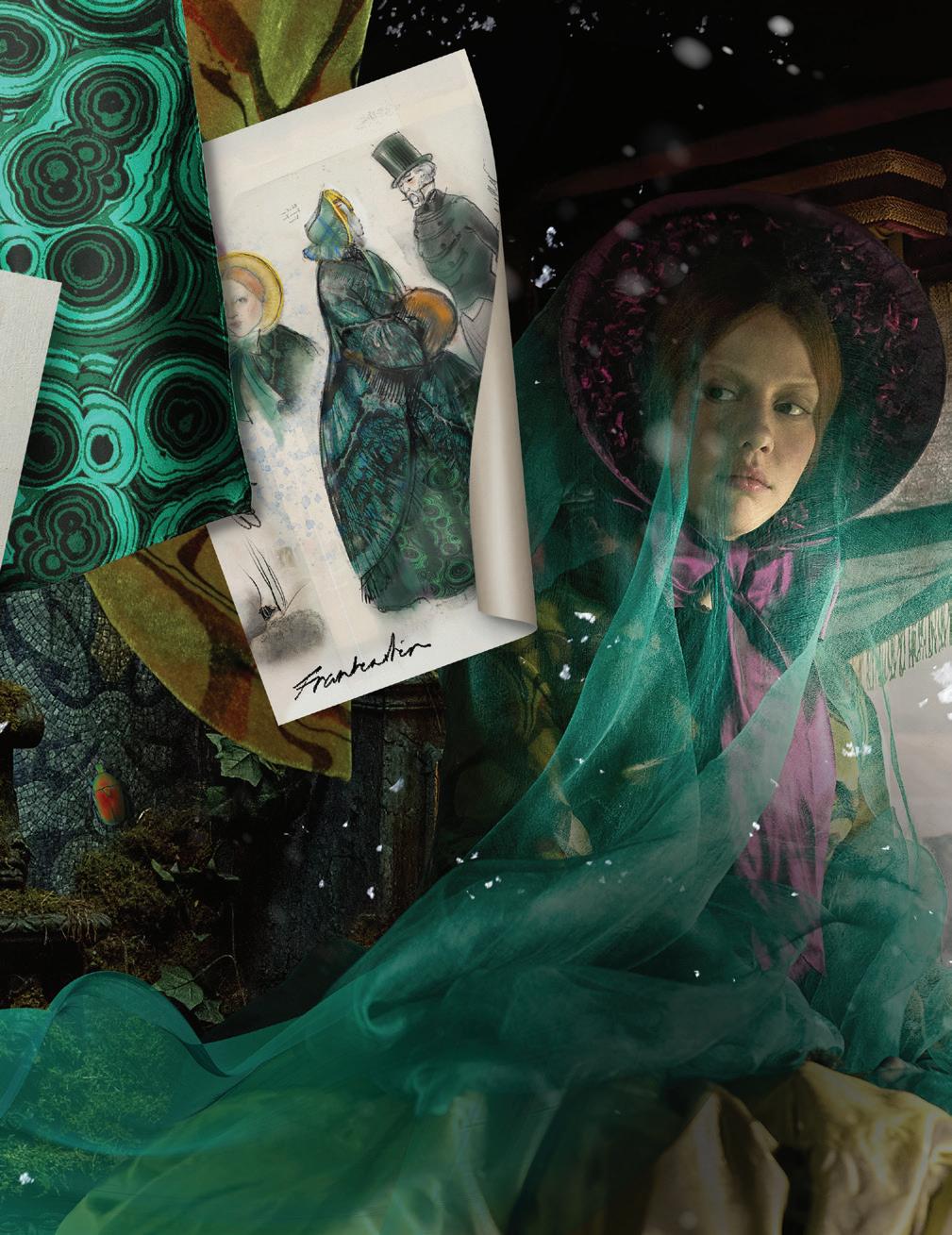 At a climactic confrontation during her wedding to William Frankenstein (Felix Kammerer), she wears a wedding dress of startling beauty and significance with sleeves and corsetry that rhyme with the Creature’s bandages and evoke the 1935 classic, BrideofFrankenstein. Several pieces of Elizabeth’s jewelry were created in collaboration with Tiffany & Co., including replicas from their archives and some bespoke items. “Guillermo drops wonderful notes about the theology of nature and religion, so that became the basis for the cross with the beetle inside.”