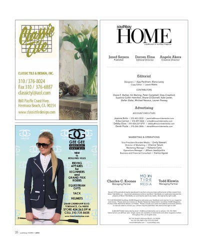 No part of this periodical may be reproduced in any form or by any means without prior written consent from Moon Tide Media, LLC. Any and all submissions to this or any Moon Tide Media, LLC publication become the property of Moon Tide Media, LLC and may be used in any media. We reserve the right to edit. TO OUR READERS Southbay HOME Magazine welcomes your feedback and reaction to our magazine and stories. Please send your letters to: Reader Response Department, Southbay HOME Magazine, PO Box 3760, Manhattan Beach, CA 90266. Please include your name and address and email address in case we need to contact you. Letters may be published. We reserve the right to edit. SUBSCRIPTIONS Subscribe by email: info@moontidemedia.com or phone: 310-376-7800. Subscriptions are $29 per year. Single copies are available at newsstands and other magazine outlets throughout the Los Angeles area. 58 11th Street • Hermosa Beach, CA 90254 Tel 310-376-7800 • Fax 310-376-0200 moontidemedia.com / oursouthbay.com