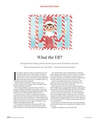What the Elf? Let’s give that creepy, pointy-eared spy an early Christmas vacation. Written by Emily DeRenzis, aka “Gelato Mama” | Illustrated by Christine Georgiades