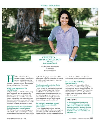 FAST FACT Dr. Hutchinson began her dentistry career in Oklahoma before relocating to the South Bay, where she completed her general dentistry residency at UCLA and worked at a private practice in Manhattan Beach. She started her own practice in 2015.