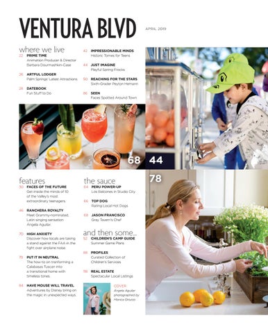 30 FACES OF THE FUTURE Get inside the minds of 10 of the Valley’s most extraordinary teenagers. 46 RANCHERA ROYALTY Meet Grammy-nominated, Latin singing sensation Ángela Aguilar. 70 HIGH ANXIETY Discover how locals are taking a stand against the FAA in the fight over airplane noise. 78 PUT IT IN NEUTRAL The how-to on tranforming a Calabasas Tuscan into a transitional home with timeless tones. 84 HAVE MOUSE WILL TRAVEL Adventures by Disney bring on the magic in unexpected ways.