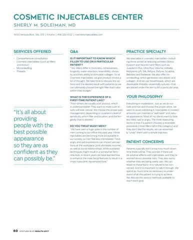 COSMETIC INJECTABLES CENTER SHERLY M. SOLEIMAN, MD 16133 Ventura Blvd., Ste. 370 | Encino | 818-322-0122 | cosmeticinjectables.com
