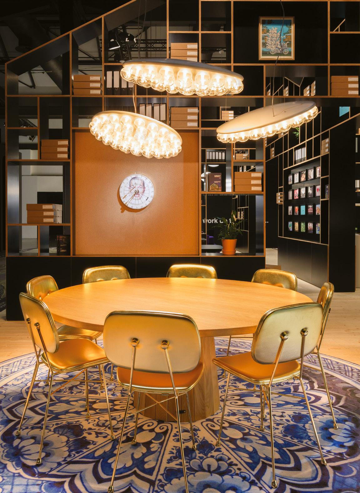 LEFT PAGE: COPPELIA SUSPENDED BY ARIHIRO MIYAKE, large black, CONTAINER TABLE CLASSIC BY Marcel Wanders in HPL black, THE GOLDEN CHAIR BY NIKA ZUPANC in various fabrics and colours.