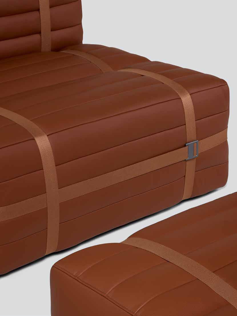 Soft, quilted cushions stack together like freshly bound hay, secured with bold straps that reference the resourcefulness of farm life. Paired with a matching Footstool, the modular design adapts effortlessly, creating intimate spaces and dynamic living areas alike.