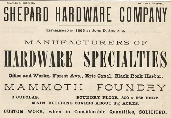 Apparently, the company name was later changed to Shepard Hardware Company. Note that Charles and Walter are cited as the principals, whereas John D. Shepard (perhaps an uncle or grandfather to Charles) is cited as company founder in 1866.