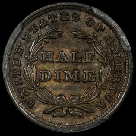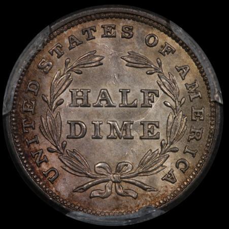The reverse of this coin has a die clash, where you can see an impression of Liberty’s right side (our right, not hers) outline especially between half and dime. It is visible elsewhere too once one knows where to look. The clash resulted when a pair of dies came together without a coin blank between them.