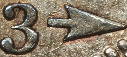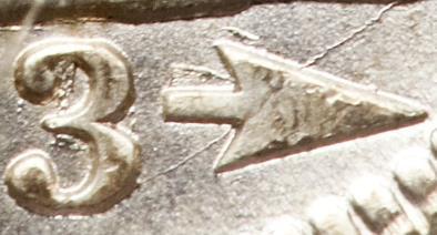 overdate. Here are a couple images courtesy of the Heritage auction archive. The first image below clearly illustrates more “crud” inside the 3, while the arrow remnants are easily more visible. These details are fainter on the second coin shown.