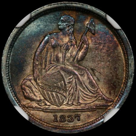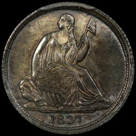 The Liberty Seated coinage was “rolled out” between 1837 and 1840, starting with the smaller denominations then working its way up to the larger ones. 1837 dawned with the older Capped Bust half dimes and dimes being made at the mint, but partway through 1837, the Liberty Seated dime and half dime made their debut.