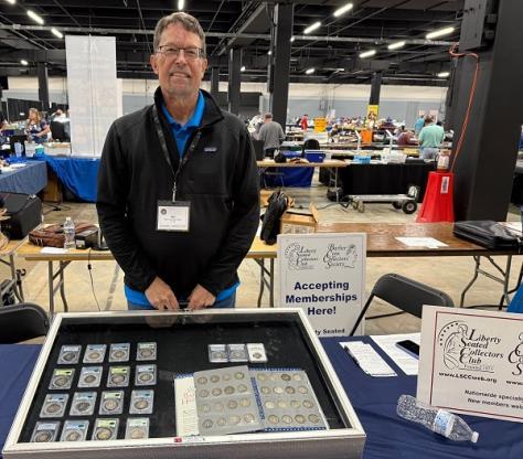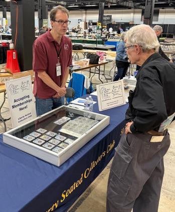 Thiswasthesecondyearthatwehad aClubtableattheDenverCoinExpo. Theshowwaswell-attended,andwe metwithmanyexistingLSCCmembers andanumberofprospectivemembers. Threenewmembersweresignedupat theshowandseveralothercoin collectorsindicatedthattheyplanned tojointheLSCCon-line. KeithPooleis showntalkingtoanattendeeinthe imagetotheright: