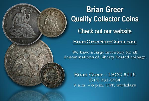 The E-Gobrechtis an award winning informal electronic publication of the Liberty Seated Collectors Club (LSCC). The LSCC is a non-profit organization dedicated to the attributions of the Liberty Seated U.S. Coin series. The LSCC provides the information contained in this “electronic” e-mail newsletter from various sources “free of charge” as a general service to the membership and other subscribers with a numismatic interest. You do not have to be a LSCC member to benefit from this newsletter; subscription to the E-Gobrecht is available on a complimentary basis to anyone. All disclaimers are in effect as the completeness and/or accuracy of the information contained herein cannot be completely verified. Contact information for LSCC and this publication can be found on the last page.