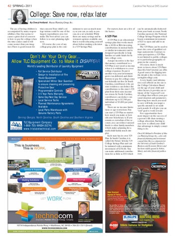 can be automatically deducted from your bank account. North Carolina sponsors the National College Savings Program which boasts a minimum investment of $25 to open and add to an account. The 529 Plans can be used to meet the costs of qualified colleges nationwide. Contrary to some perceptions, a 529 Plan is not limited to public colleges or to particular geographic regions in the country. Of course, there is much more to know about 529 Plans than this brief tutorial can offer. A good source for digging into the details is the website www. savingforcollege.com. A very handy (and informative) tool offered on the site is the College Calculator. Based on the age of your child and other factors, it provides an estimate of the “expected” cost of college that reflects your personal situation and parameters. Knowing how much you need to save will help you target a specific amount to set aside each month. It will give you an “end” goal to work toward. Few opportunities have more impact on the success of a person’s life than earning a college education. Starting to save now to afford your child that advantage is simply a smart thing to do. Cheryl R. Holland is President of Abacus Planning Group, Inc., a fee-only financial planning and investment counsel firm She is a columnist for the University of South Carolina’s Business and Economic Review and has been widely quoted in Forbes, Money, and other financial publications.