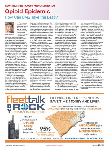term success rates are between 46 to 54 percent.There are fewer logistical constraints to receiving Buprenorphine, it has fewer interactions with other drugs, and it is difficult to overdose on. It is also only a partial agonist at the opioid receptor.This means that although it occupies and binds tightly to the opioid receptor it does not give as strong of an effect on the body as do other opioids. This is why it is unlikely for patients to overdose on Buprenorphine. Even if EMS agencies are not helping patients get into MAT programs all EMS provides should be aware of what treatments are available for opioid use disorder. One EMS agency in Florida actually helps patients get started on MAT in the field.There are also other EMS agencies in North Carolina who are looking at helping patients get started on MAT. EMS needs to take the lead in addressing the opioid epidemic whether it’s by administering naloxone, encouraging harm reduction strategies or by encouraging people to enter MAT. EMS providers live and work in their communities so they often have more insight into what is happening than anyone else. EMS providers must be leaders who help stop this epidemic and save our communities. Dr. Winslow graduated from Emergency Medicine residency from UNC-Chapel Hill in 2002 and completed his EMS Fellowship in 2003. He has worked at Baptist Hospital in WinstonSalem for the past 11 years. He was appointed as the Medical Director of the NC Office of EMS in 2011. This document contains all protocol, procedures, and policies for all EMS agencies in North Carolina.