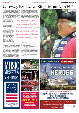 Muskets and Merriment” downtown to Patriots Park on Oct. 12, 2013. all shuttle stops and on-board tour guides will share the history of Kings Mountain. A special 5k race will start out the festival, winding through the West End Historic District. A wide array of art, craft and food vendors will be throughout Patriots Park. The event is free. For more information, call 704-7340333 or visit www.cityofkm.com.