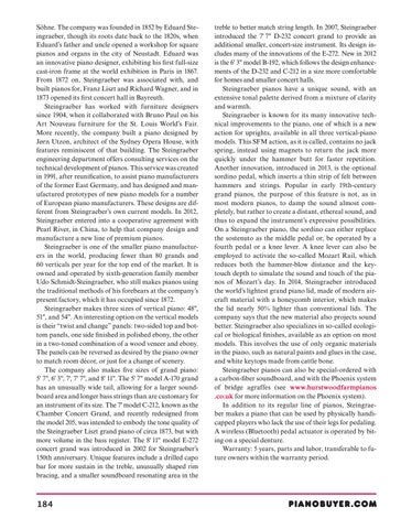 treble to better match string length. In 2007, Steingraeber introduced the 7' 7" D-232 concert grand to provide an additional smaller, concert-size instrument. Its design includes many of the innovations of the E-272. New in 2012 is the 6' 3" model B-192, which follows the design enhancements of the D-232 and C-212 in a size more comfortable for homes and smaller concert halls. Steingraeber pianos have a unique sound, with an extensive tonal palette derived from a mixture of clarity and warmth. Steingraeber is known for its many innovative technical improvements to the piano, one of which is a new action for uprights, available in all three vertical-piano models. This SFM action, as it is called, contains no jack spring, instead using magnets to return the jack more quickly under the hammer butt for faster repetition. Another innovation, introduced in 2013, is the optional sordino pedal, which inserts a thin strip of felt between hammers and strings. Popular in early 19th-century grand pianos, the purpose of this feature is not, as in most modern pianos, to damp the sound almost completely, but rather to create a distant, ethereal sound, and thus to expand the instrument’s expressive possibilities. On a Steingraeber piano, the sordino can either replace the sostenuto as the middle pedal or, be operated by a fourth pedal or a knee lever. A knee lever can also be employed to activate the so-called Mozart Rail, which reduces both the hammer-blow distance and the keytouch depth to simulate the sound and touch of the pianos of Mozart’s day. In 2014, Steingraeber introduced the world’s lightest grand piano lid, made of modern aircraft material with a honeycomb interior, which makes the lid nearly 50% lighter than conventional lids. The company says that the new material also projects sound better. Steingraeber also specializes in so-called ecological or biological finishes, available as an option on most models. This involves the use of only organic materials in the piano, such as natural paints and glues in the case, and white keytops made from cattle bone. Steingraeber pianos can also be special-ordered with a carbon-fiber soundboard, and with the Phoenix system of bridge agraffes (see www.hurstwoodfarmpianos .co.uk for more information on the Phoenix system). In addition to its regular line of pianos, Steingraeber makes a piano that can be used by physically handicapped players who lack the use of their legs for pedaling. A wireless (Bluetooth) pedal actuator is operated by biting on a special denture. Warranty: 5 years, parts and labor, transferable to future owners within the warranty period.