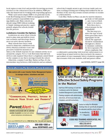 school day. It simply means to get everyone inside and continue teaching, learning and working until notified by the authorities of the next step: resume normal activities or escalate to a full lockdown. Code Blue: Shelter in Place can also be used for disasters, gas leaks or wild animals — any event in which it’s safer to be indoors. How, then, does a school prepare for the unthinkable? The first step is to select the type of lockdown procedure that’s appropriate for the school.The approach should be standardized throughout a district to minimize confusion for first responders. We always emphasize that a collaborative partnership with local law enforcement is essential. Keep in mind, however, that you know the nuances and realities of your community. Select a lockdown approach that resonates with your students, staff and parent culture. see SCHOOL SAFETY page 58