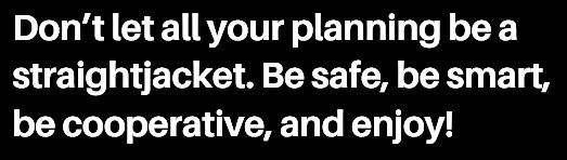 Whew. You’ve stuck with this. You’ve got your whole crew on board. You agree with the trip’s objectives You have all the things and training needed to support it Here’s the sanity check Go over each day in your head. Each activity. Envision it, envision what you need to do it. Ensure your list has it on it Ensure you’ve bought it.