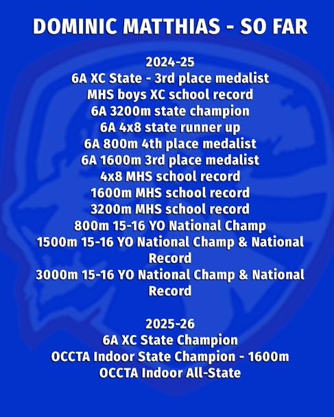 His stellar performance in cross country also earned Matthias the 2025 Oklahoma Cross Country Gatorade Player of the Year title. Over the summer, Matthias finished 46th at Nike Cross Nationals and earned First Team All-Region honors at the NXN South Championships.