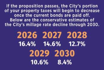 That decline will be felt over the next fourto-five years as the city pays off the current GO bonds still on the books. The current projected millage rate in the City of Moore is 16.5%. If voters approve the one-cent sales tax increase, the millage rate is projected to be 8.4% by 2030. (see graphic for projected decline).
