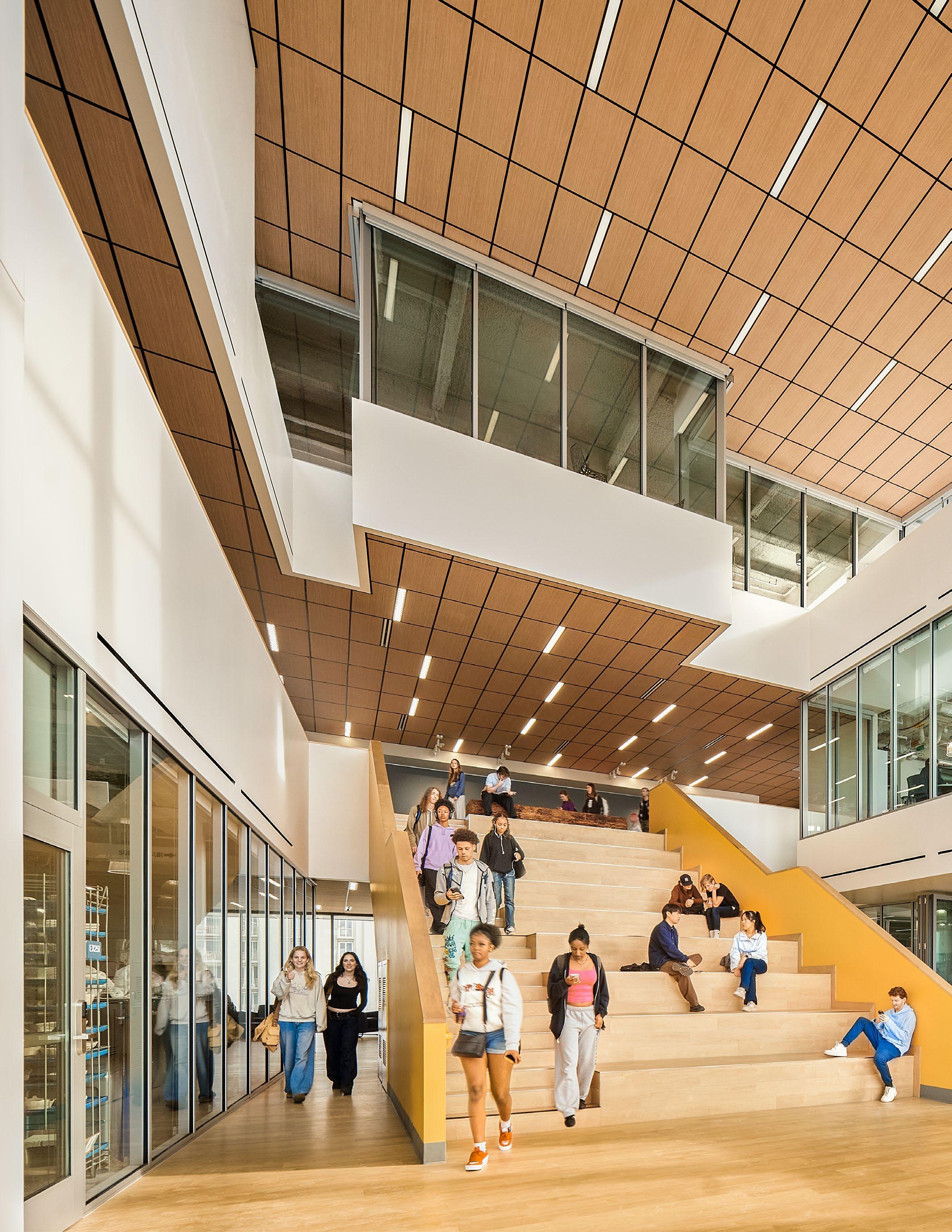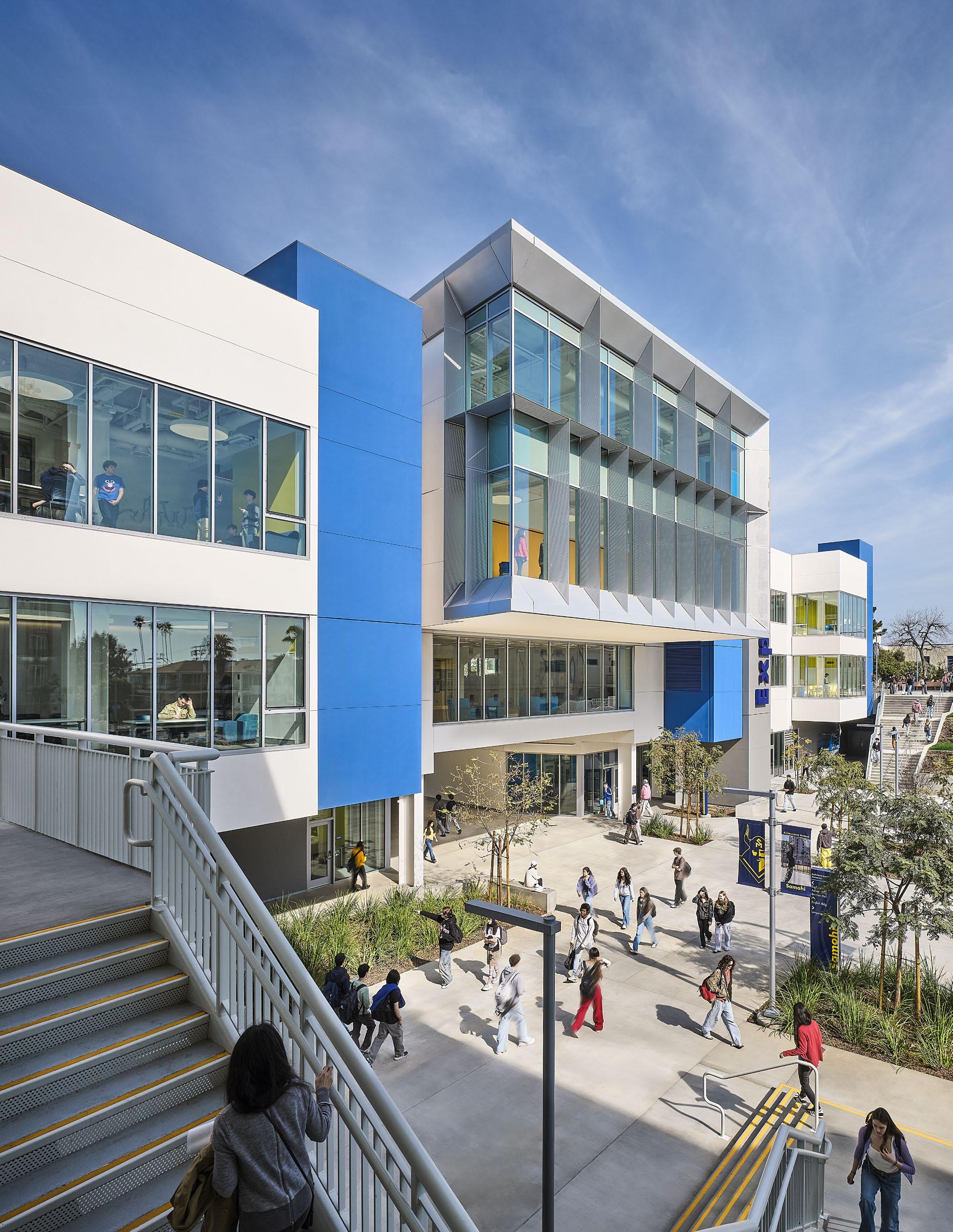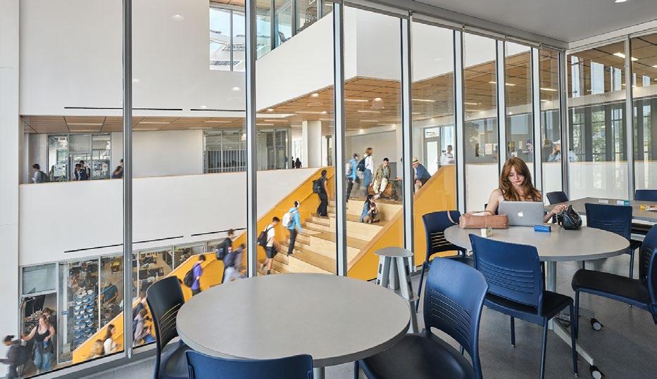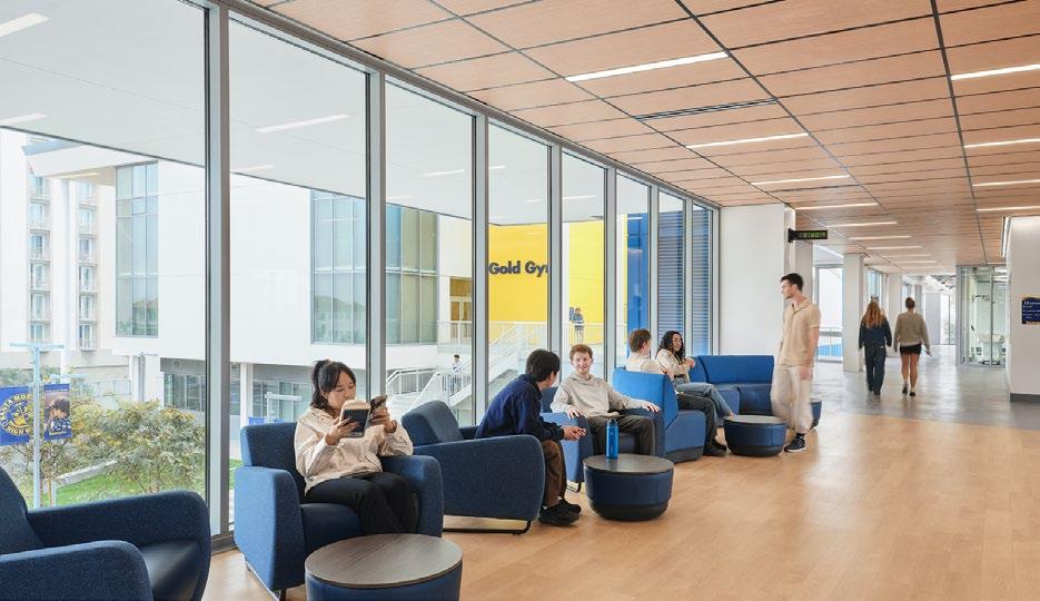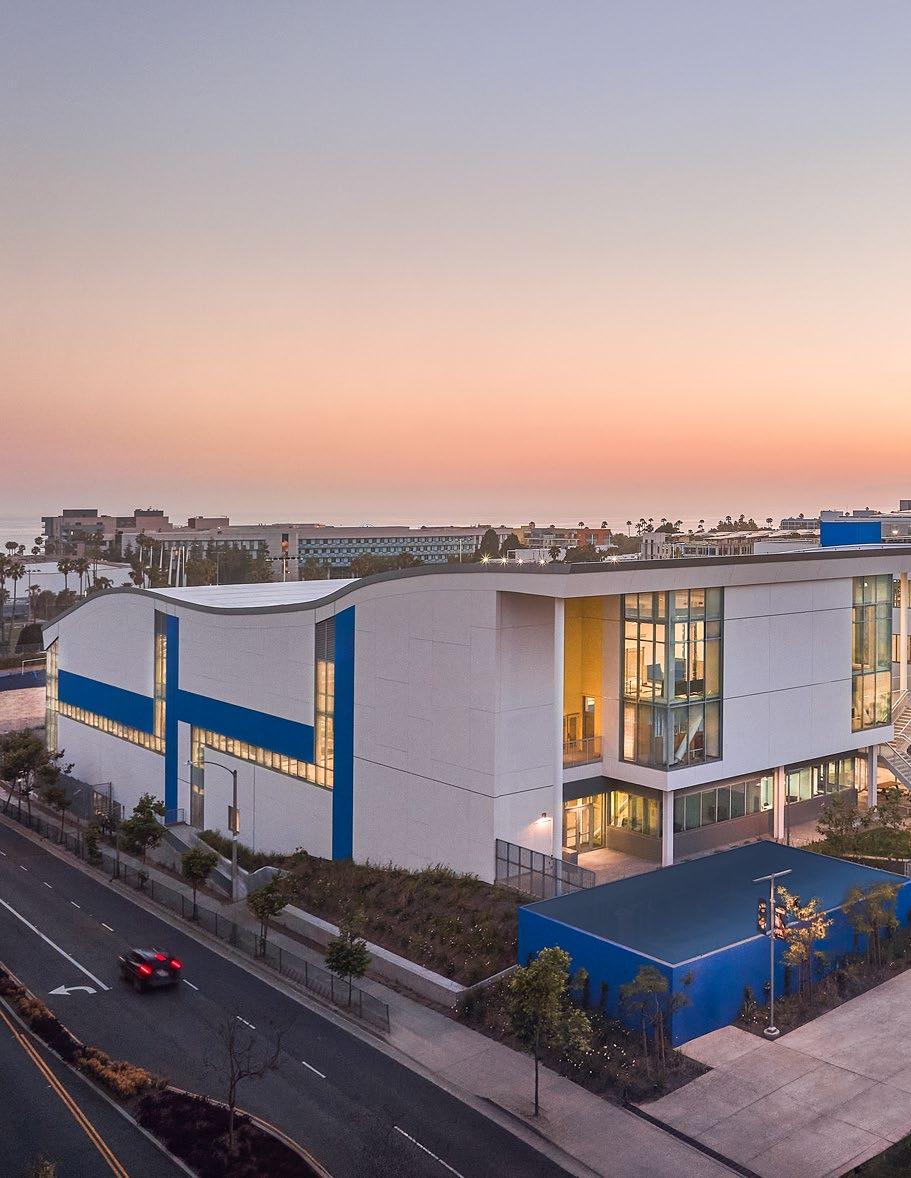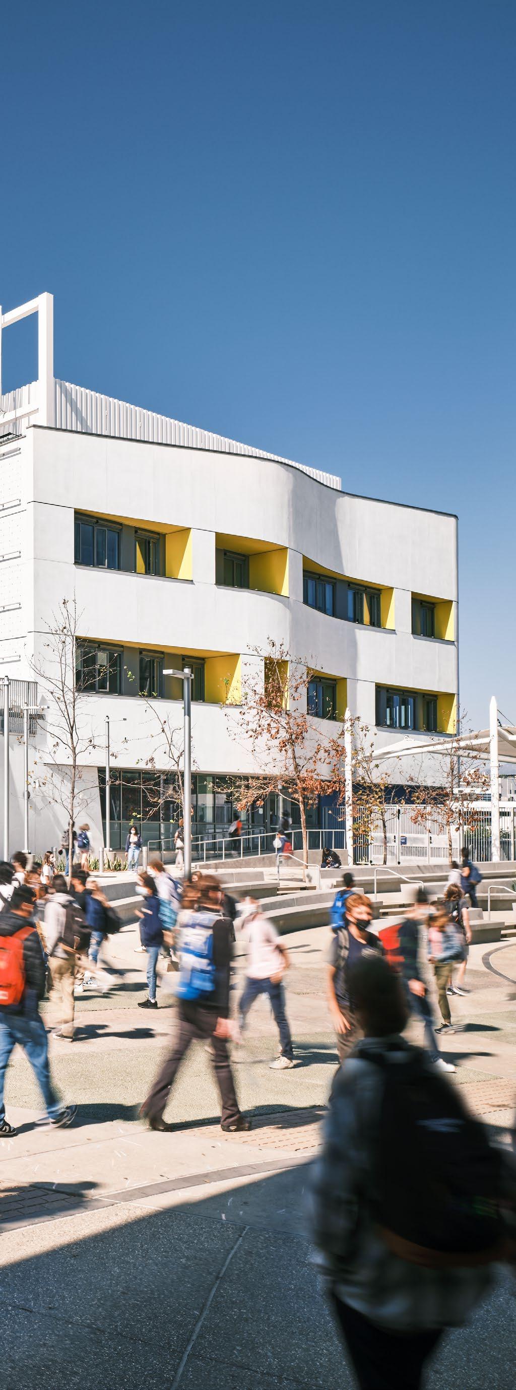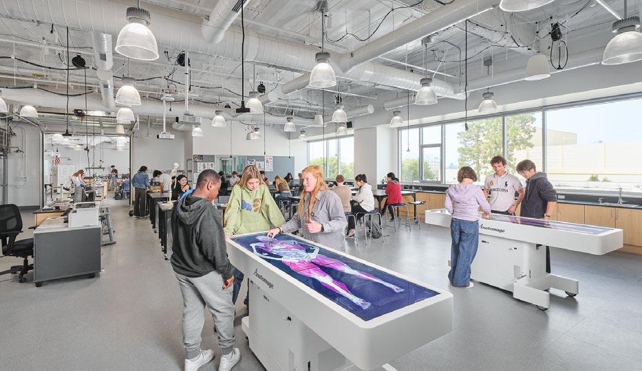 Discovery brings together classrooms, science labs, makerspaces, student support, dining, and athletic spaces under one roof—including a collegiatelevel Aquatic Center featuring a 50m Olympic swimming pool that serves both student athletes and the broader Santa Monica community. Its “open building” concept supports evolving pedagogy by enabling interior spaces to adapt over time as programs change.