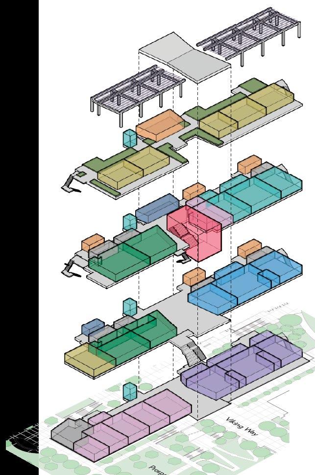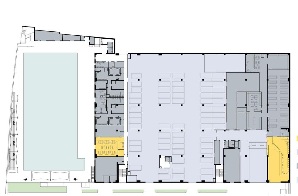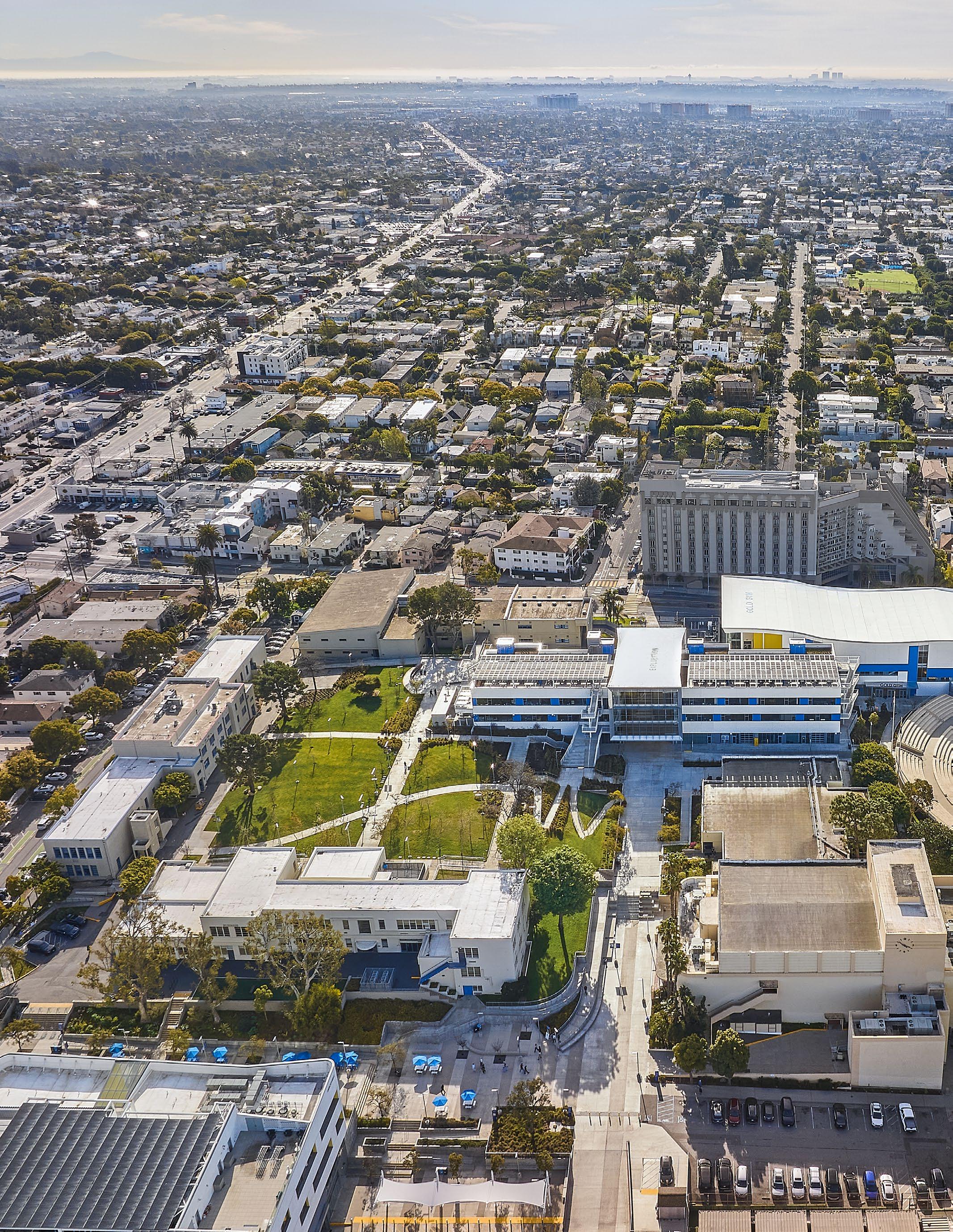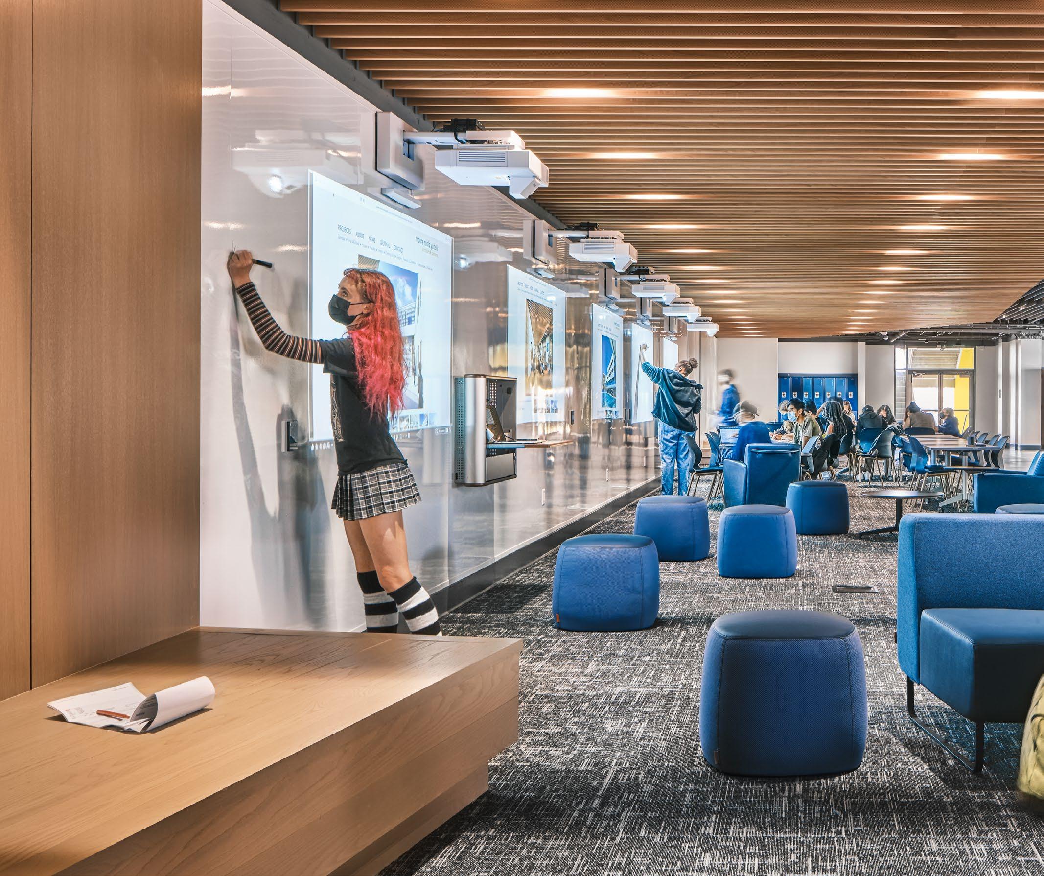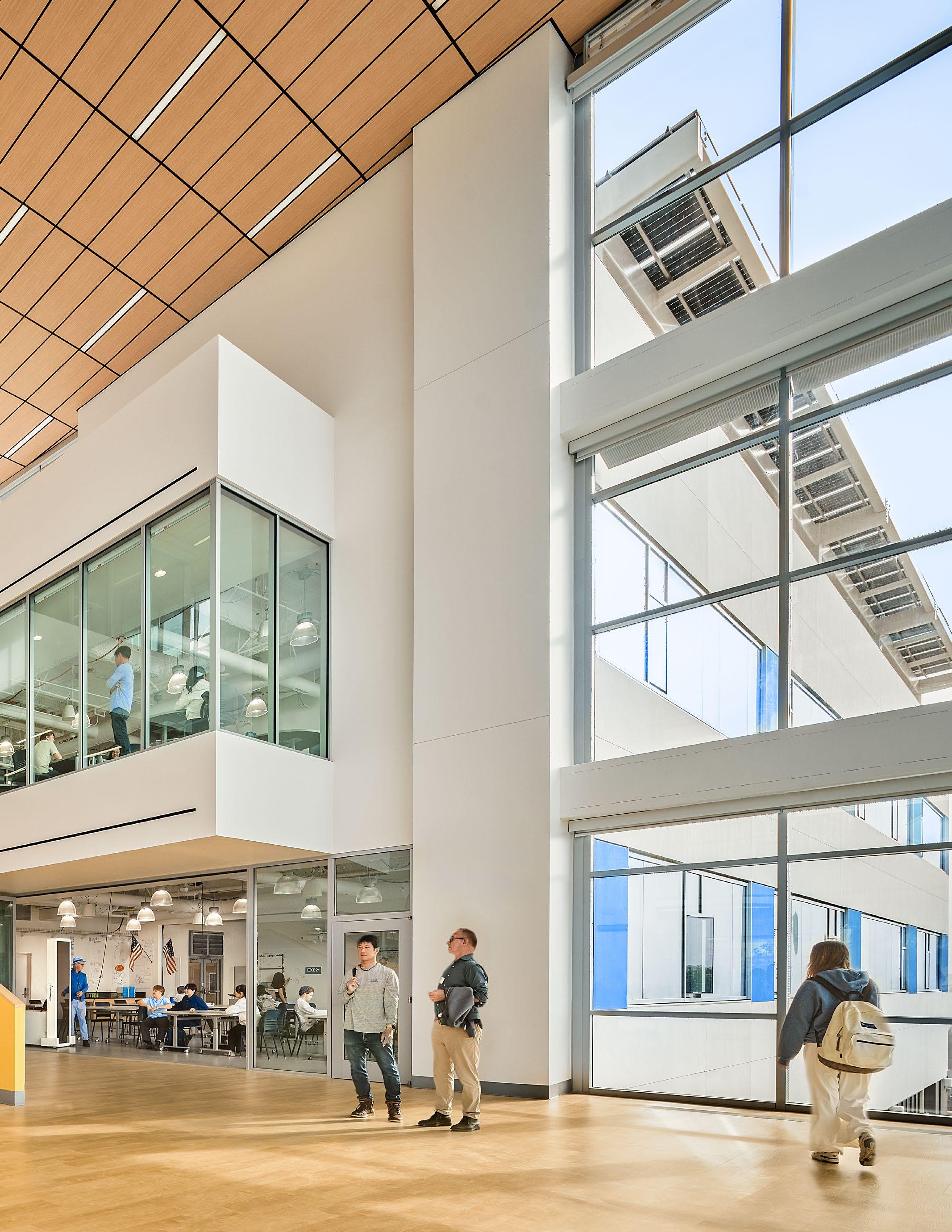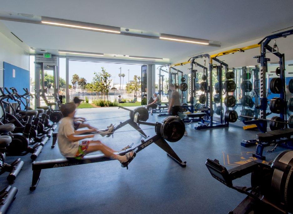 Discovery brings together classrooms, science labs, makerspaces, student support, dining, and athletic spaces under one roof—including a collegiatelevel Aquatic Center featuring a 50m Olympic swimming pool that serves both student athletes and the broader Santa Monica community. Its “open building” concept supports evolving pedagogy by enabling interior spaces to adapt over time as programs change.