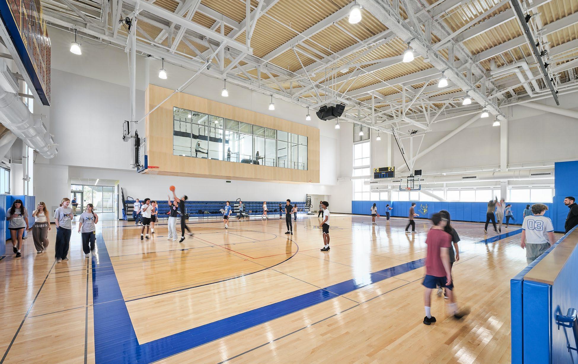 adjacent support program to provide direct access for occupants. The two-court configuration allows for multiple uses from practice games, competitions to multi-purpose assemblies, supported by 800-seats of telescoping bleachers. The building also contains inclusive locker rooms, supports dance classes, pep squad, health classes, a fully-equipped fitness studio, and yoga studio.